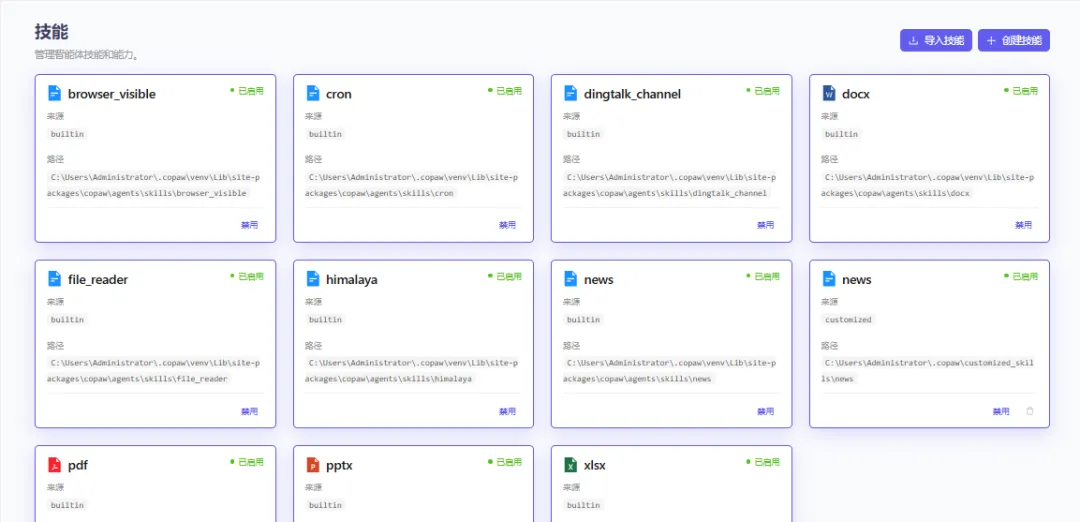 Copaw 的强大之处在于其模块化的 Skills 架构。每个 Skill 对应一项专业能力,例如: