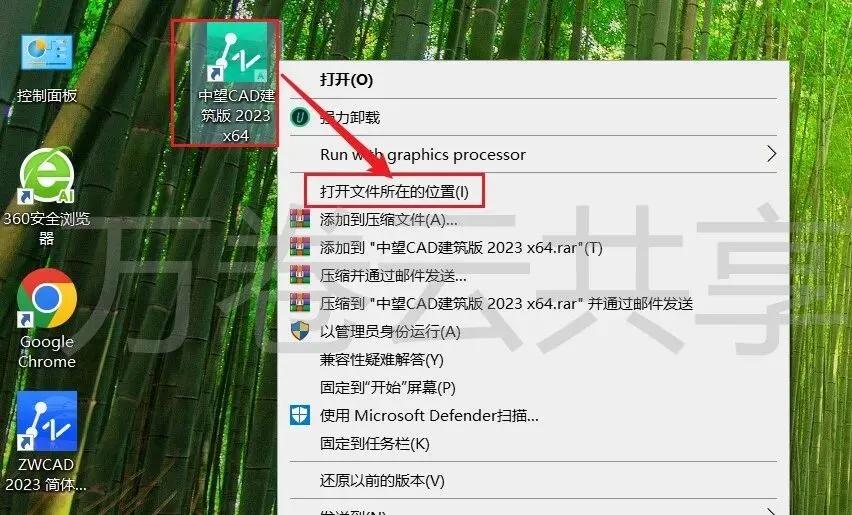 9.鼠标右击→桌面中望CAD建筑版2023,选择→打开文件所在的位置