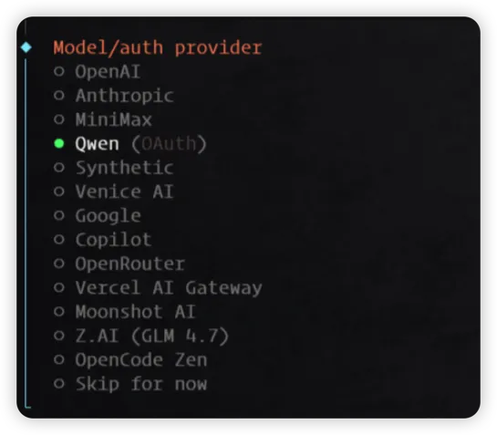 第三步选择模型服务商,这里选择 Qwen,免费额度充足,适合入门使用