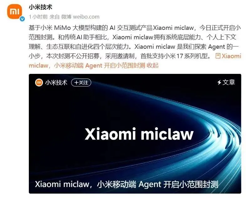 据@小米技术 官方消息,“基于小米MiMo大模型构建的AI交互测试产品Xiaomi miclaw,今日正式开启小范围封测。和传统AI助手相比,Xiaomi miclaw拥有系统底层能力、个人上下文理解、生态互联和自进化四个层次能力。Xiaomi miclaw是我们探索Agent的一小步,本次封测不公开招募,采用邀请制,首批支持小米17系列机型。 ”