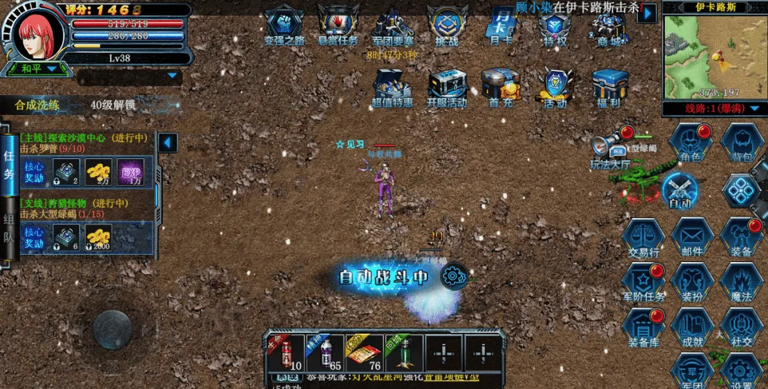 装备强化方面,格斗家优先强化胸甲和头盔,魔法师优先武器和戒指,别乱花强化石。游戏里有自由交易系统,刷到用不上的金装碎片可以挂交易行卖掉,平民玩家也能通过搬砖回本。离线挂机功能也很贴心,睡觉前开启,第二天上线收菜,经验金币一样不少。
