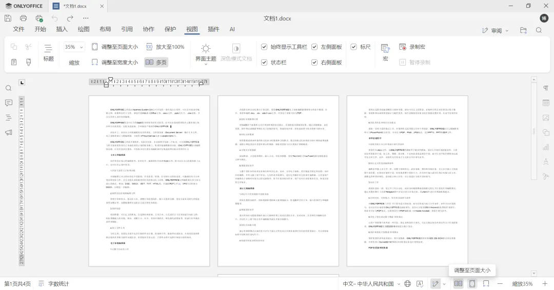 如需关闭多页视图,只需点击底部工具栏的调整至页面大小按钮,或再次点击视图选项卡中的多页即可。