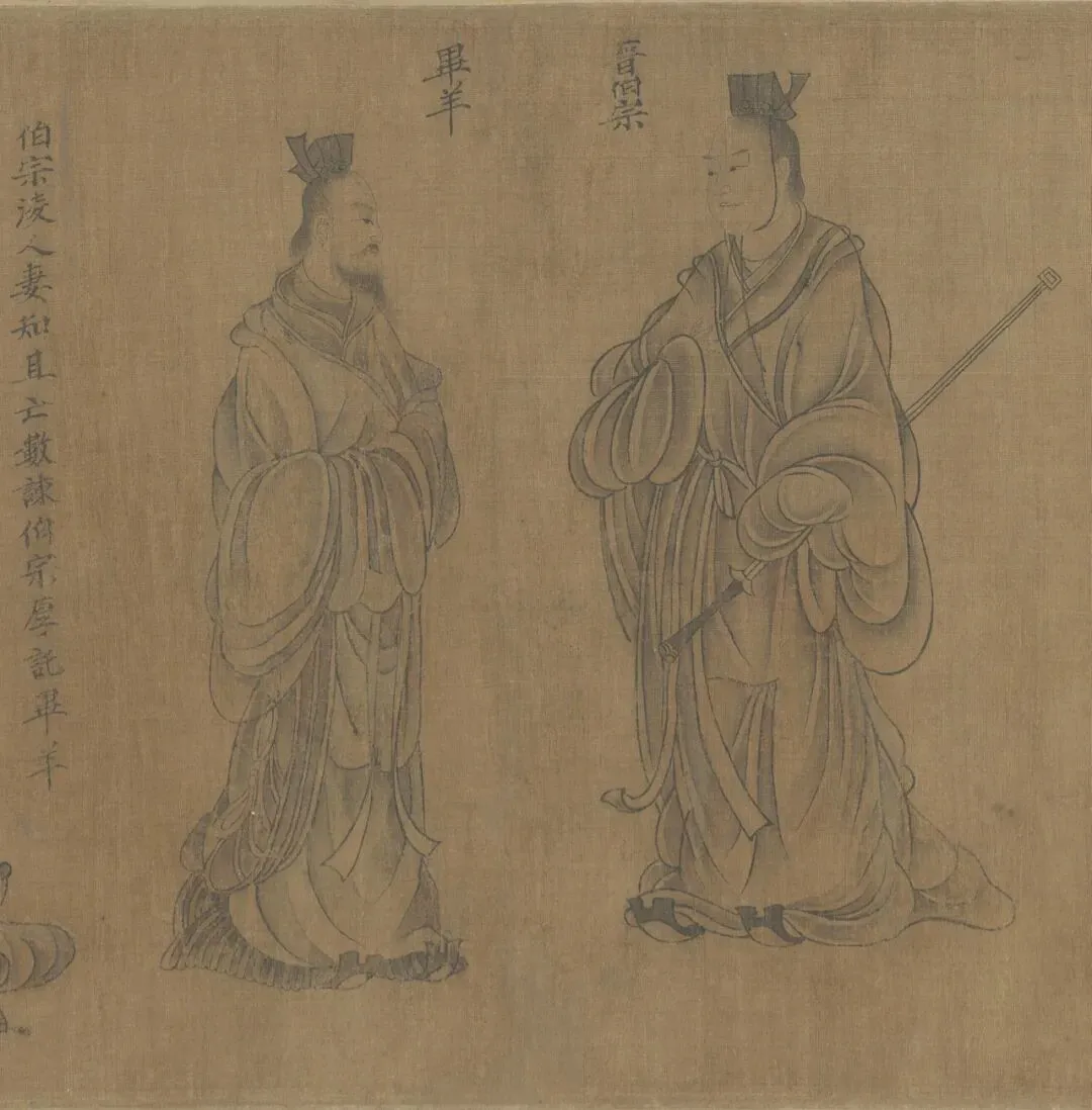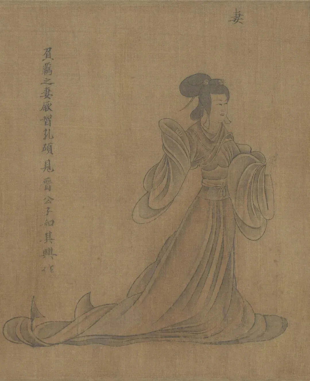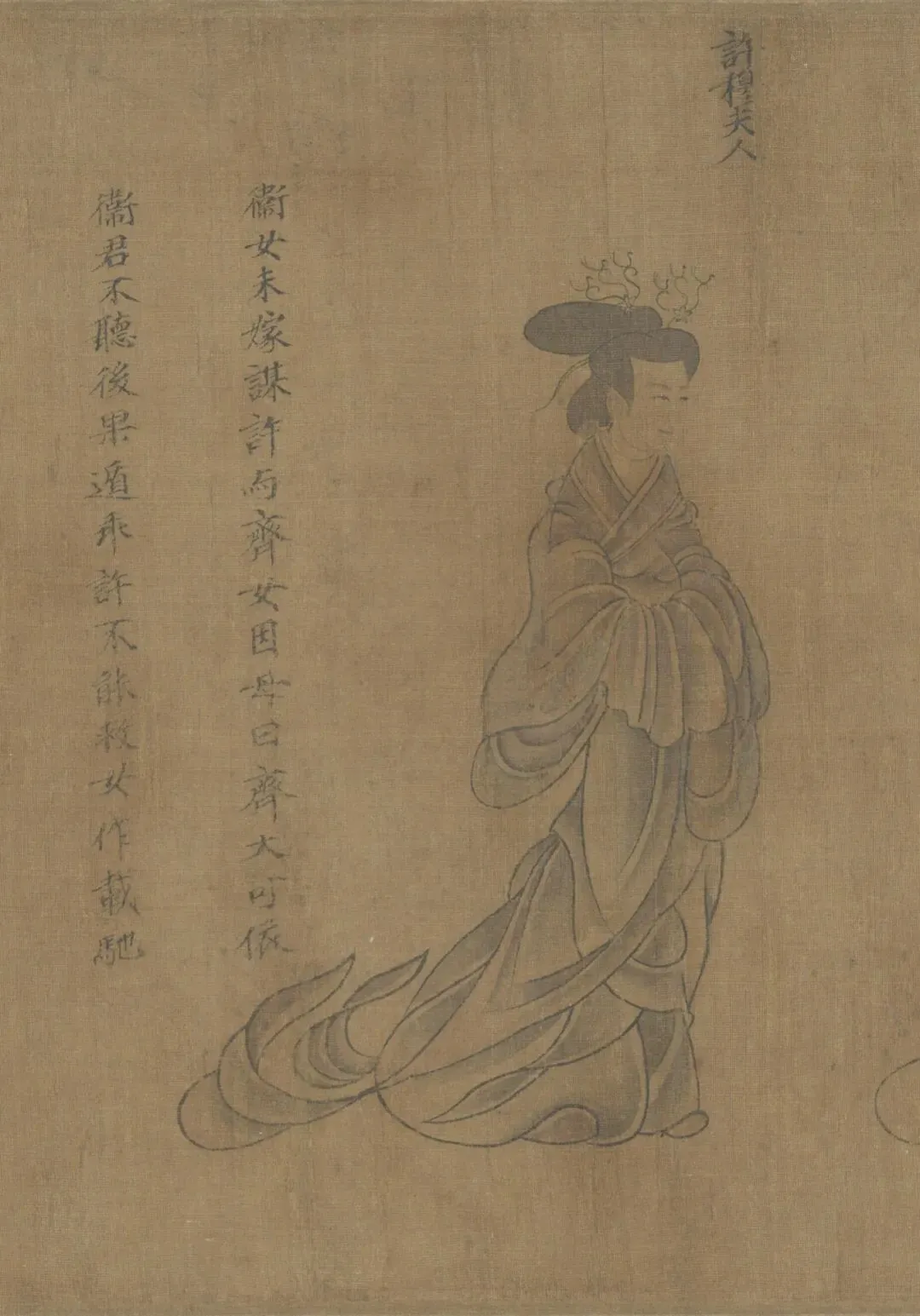 此卷多处保存了汉代的衣冠制度,如男子头戴进贤冠,身着曲线大袖袍,腰结绶带并配挂长剑;女子梳着垂髾髻,身着深衣,特别是眉毛涂以朱色,是模仿赵昭仪的新妆,这些都表现了特定时期的风俗和时尚。又蘧伯玉所乘坐的马车称 “轺车”,亦为汉代形制,描绘得非常细致而无错误,这些都可以从大量出土的汉代画像石、砖和壁画中找到与之相应的图象。此为宋人摹本,绢本墨笔淡着色,旧传东晋顾恺作。该画是清宫旧藏,经《庚子销夏记》、《石渠宝笈初编》等书著录。后由溥仪携出,旋入长春伪宫,1953年连同已佚散的历代名贵书画百余件回到故宫博物院。