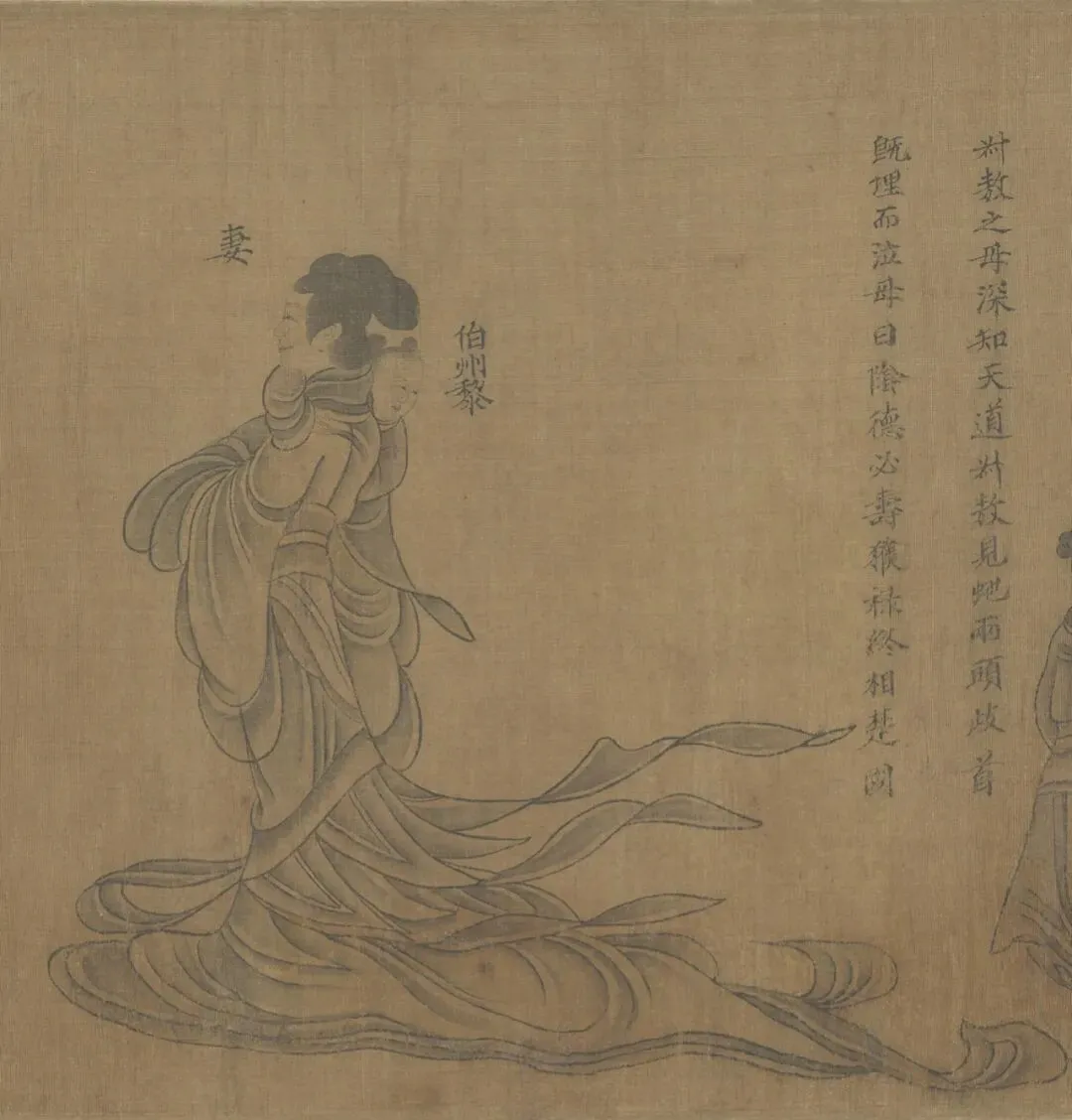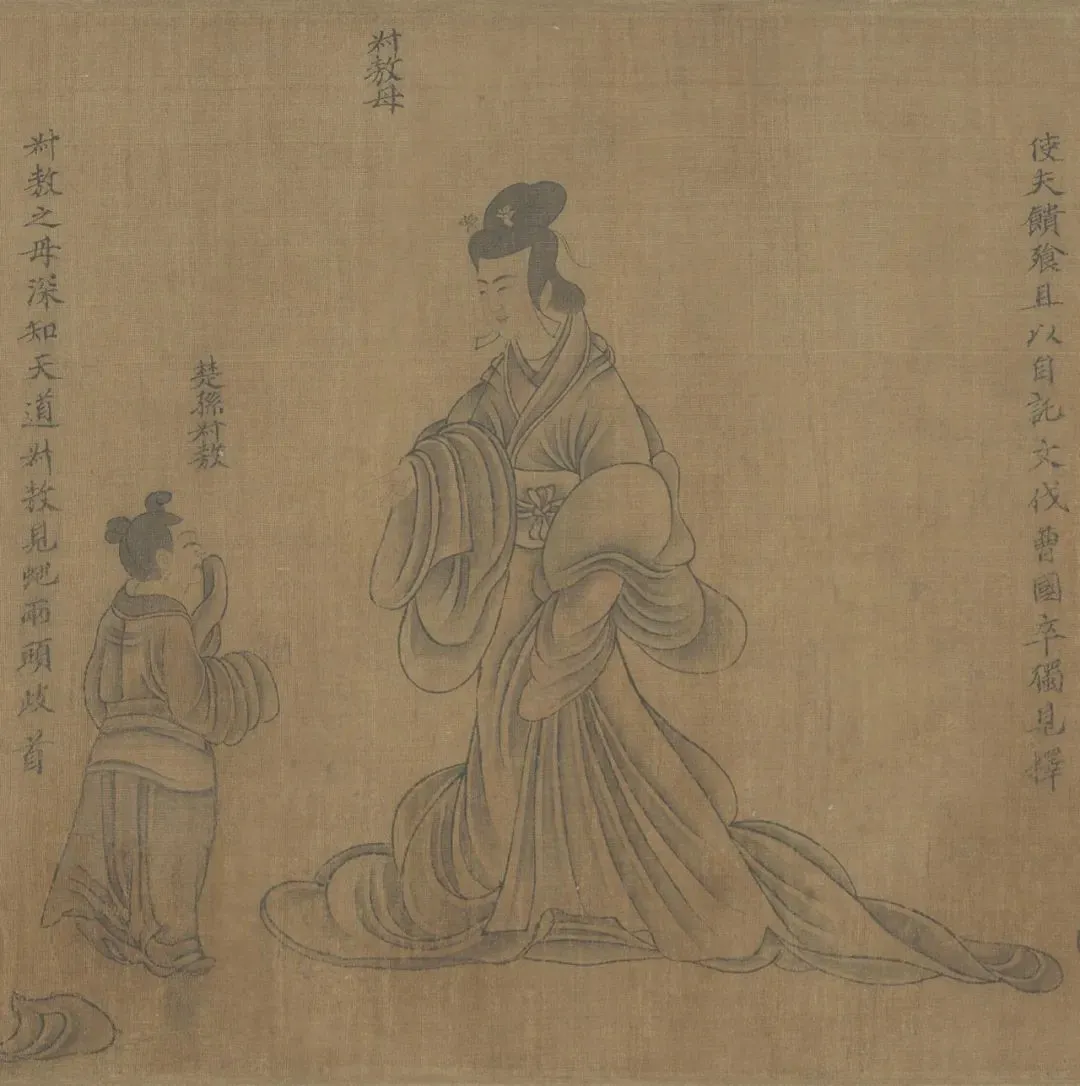 十、“晋范氏母”故事,已残,仅存两人,即长子和仲子。原绘晋范氏母正在训诫儿子,晋范氏母的图像在清代以前已损毁。