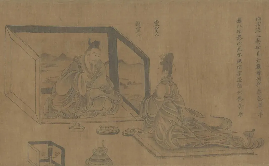 六、“卫灵公夫人识贤”故事。一天深夜,卫灵公听到宮外远处传来马车声,停息一会后又隐起。卫灵公夫人认定是蘧伯玉从门前经过,她说伯玉是贤臣,惟有他能自觉地在夜行中恪守礼制,在途经宮门时,会下车轻声缓行。卫灵公出去查询,果真是伯玉。图中卫灵公坐屏风内发问,夫人对坐回答,宮外画乘车和步行的伯玉,表现伯玉经过宮门前后的连续性动作。