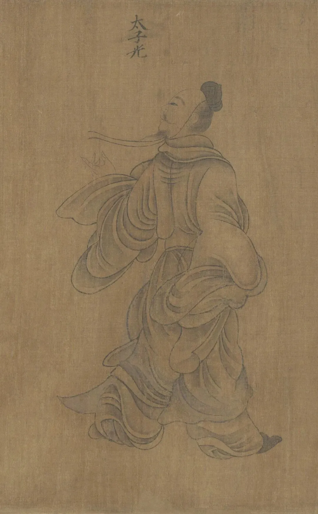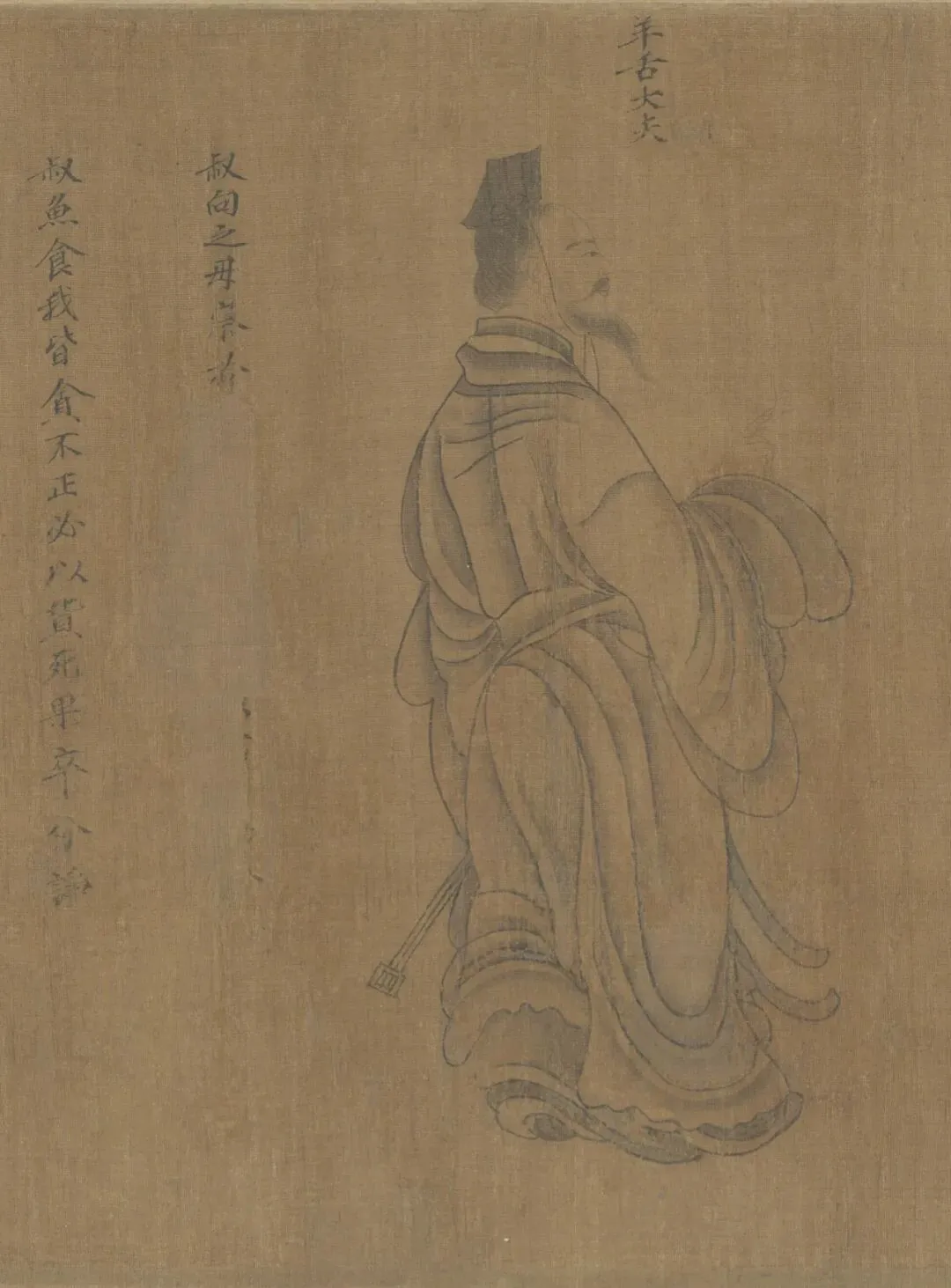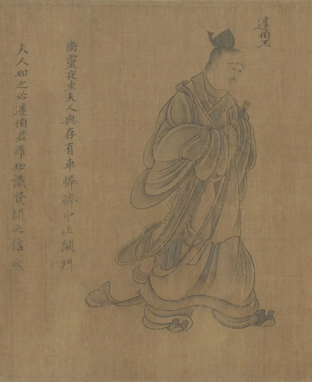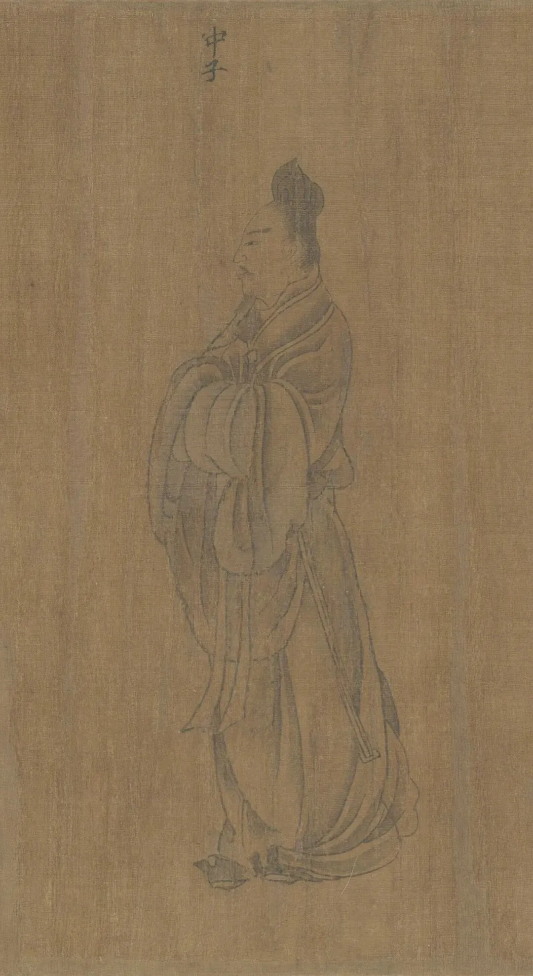 七、“齐灵仲子”故事,此段不全,只存一人。齐灵仲子是齐灵公的夫人。起初,灵公娶声姬,生子光,被立为太子,后娶仲子生子名牙,灵公欲废子光而立牙为太子,仲子辞说不可。图中太子光挥手而去,疾步中还回首一顾。