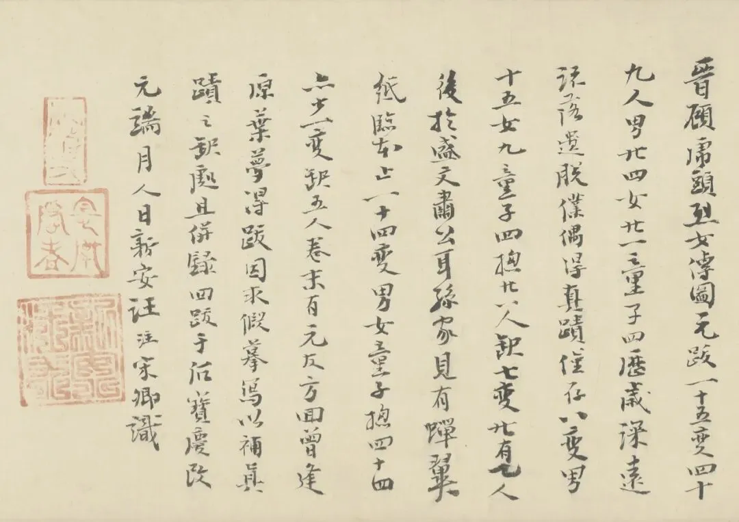 卷幅前有无名氏题:顾恺之列女图 一行,但字款漫漶,唯有 “恺” 字清晰可辨;卷后有元代新安汪注、宋卿,明代叶隆礼、王铎四家题跋。还有蕉林書屋、宣統鑑賞、宣統御覽之寳、乾隆御覽之寶、無逸齋精鑑璽、五福五代堂古稀天子寶、八徵耄念之寶等等钤印信息。