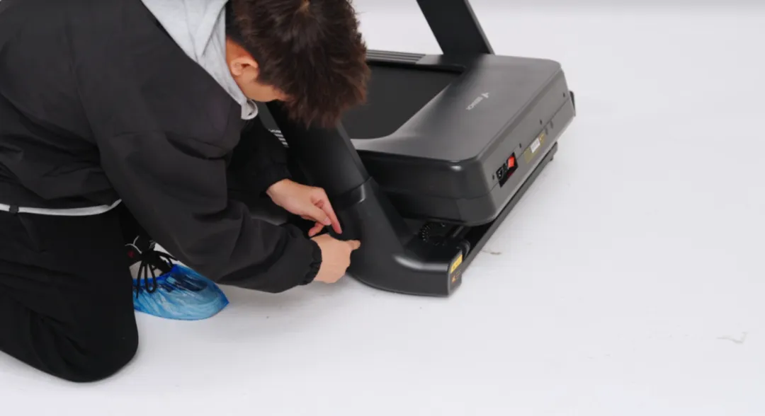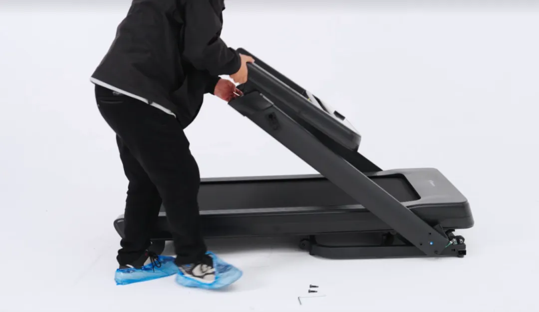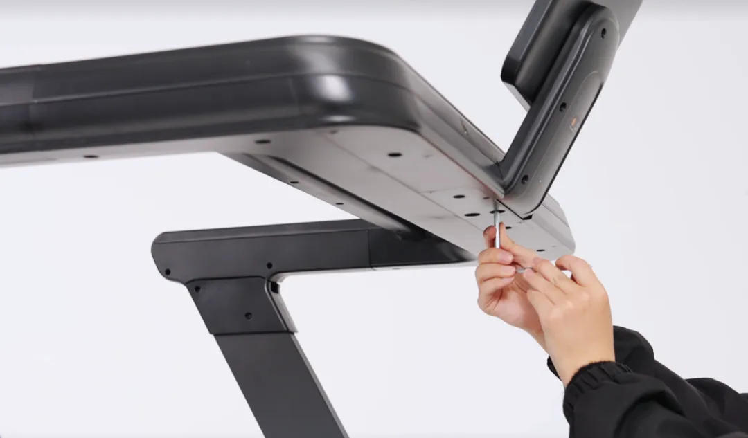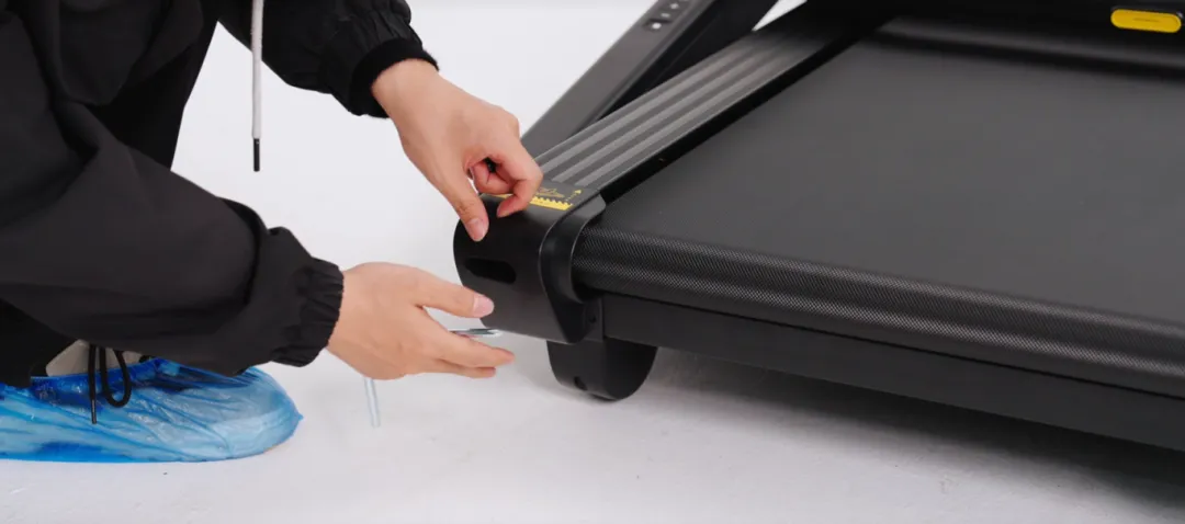 取出左右后脚罩,与跑步机主体结合,对准孔位,用L型扳手锁上螺丝并紧固;另一侧同样操作。