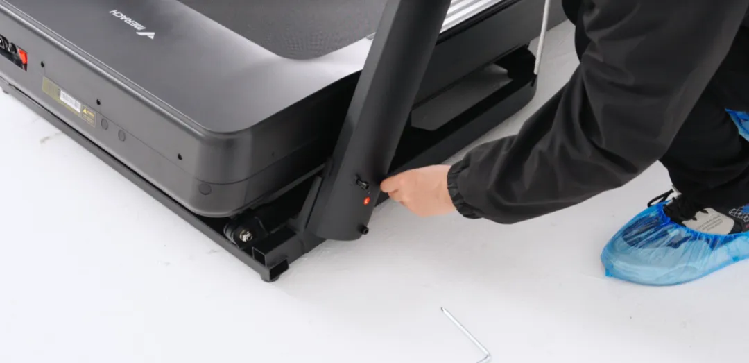 将跑步机扶手管组抬起来,使扶手管组和立柱管垂直,对准孔位,用L型扳手锁上先前拆下的螺丝并紧固好。