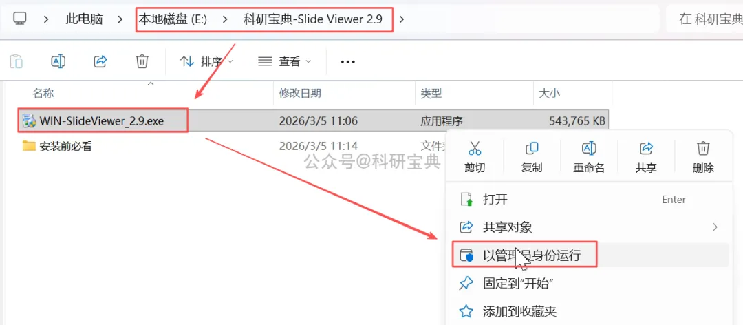 1、下载压缩包【科研宝典-Slide Viewer 2.9】至电脑本地,并解压(我们压缩时候没有设置密码,如果解压时候需要密码,请换一个解压软件),得到如下文件;选择【WIN-SlideViewer2.9.exe】,【右键】-【以管理员身份运行】;
