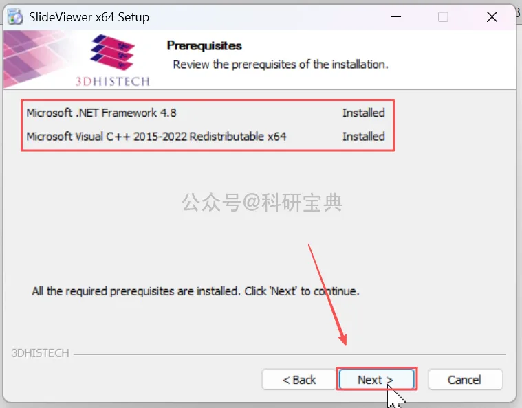 4、该软件安装需要同时安装以下两个组件(若电脑上已安装会如下显示【Installed】,未安装直接点击安装即可),点击【Next】;