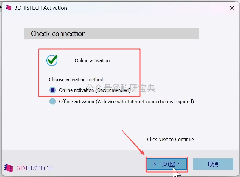 6、等待【Check connection】结束后,勾选【Online activation】,并点击【下一页】;