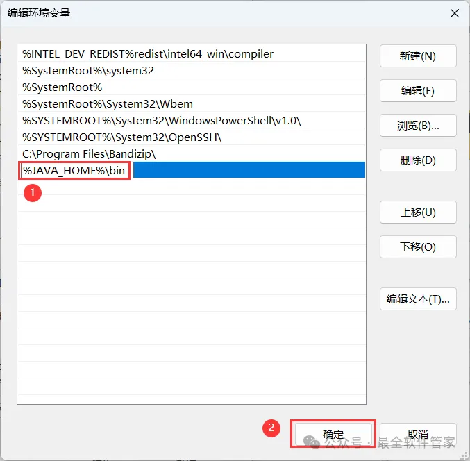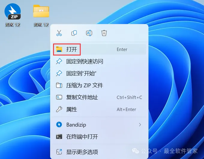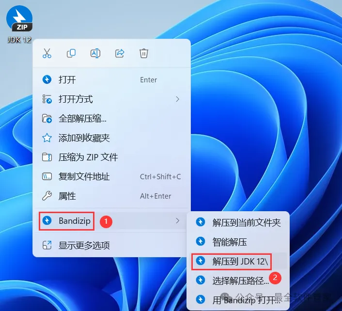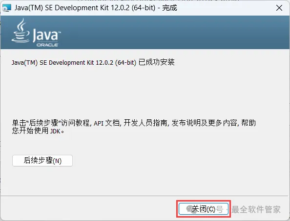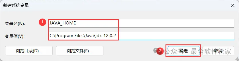[不限速下载]:免费获取百度网盘不限速下载工具。公众号内回复:不限速[注意事项]:安装前请关闭网络、杀毒软件和防火墙,否则易安装失败。公众号内回复:1[解压软件]:小编用的解压软件是Bandizip,获取Bandizip软件安装包。公众号内回复:21、下载JDK 12软件安装包到电脑上,右键选择【解压到JDK 12\】8、回到桌面,右键桌面上的【此电脑图标】,点击【属性】 12、变量名输入:JAVA_HOME;变量值输入:C:\Program Files\Java\jdk-12.0.2,再点击【确定】13、在系统变量一栏,找到【Path】,选中它,再点击【编辑】 15、内容输入:% JAVA_HOME%\bin,再点击【确定】 17、内容输入:% JAVA_HOME%\jre\bin,再点击【确定】 20、回到桌面,按下快捷键【WIN图标+R】,输入【cmd】,再点击【确定】 21、输入:java -version,按下键盘上的【Enter】回车键,查看JDK版本号22、输入:java,,按下键盘上的【Enter】回车键,得到下列反馈 23、输入:javac,,按下键盘上的【Enter】回车键,得到下列反馈,则JDK安装及配置成功24、以上就是JDK 12软件安装的全过程,要是对你有帮助的话,请为小编点个赞! 免责声明:软件资源均来源于网络,仅供用户交流学习与研究使用,版权归属原版权方所有,版权争议与本公众号无关,用户本人下载后不能用作商业或非法用途,否则后果均由用户承担责任;如果您访问和下载此文件,表示您同意只将此软件用于参考、学习而非其他用途,否则一切后果请您自行承担,请于下载后24小时内删除,不允许用于商业用途,否则法律问题自行承担。如果您喜欢该软件,请支持正版软件,购买注册,得到更好的正版服务。