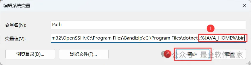16、再变量值最后输入文本:;% JAVA_HOME%\bin,再点击【确定】