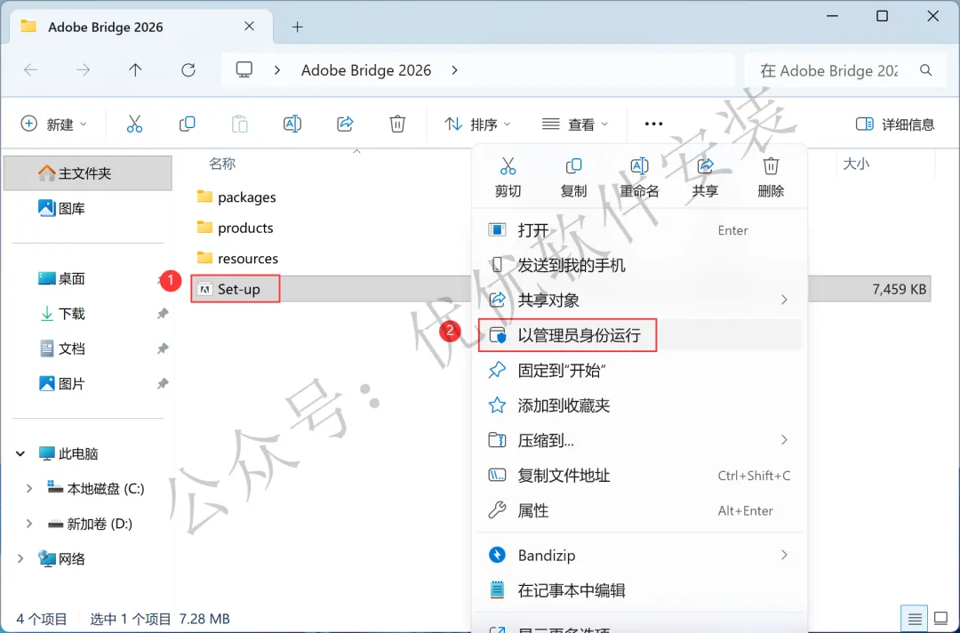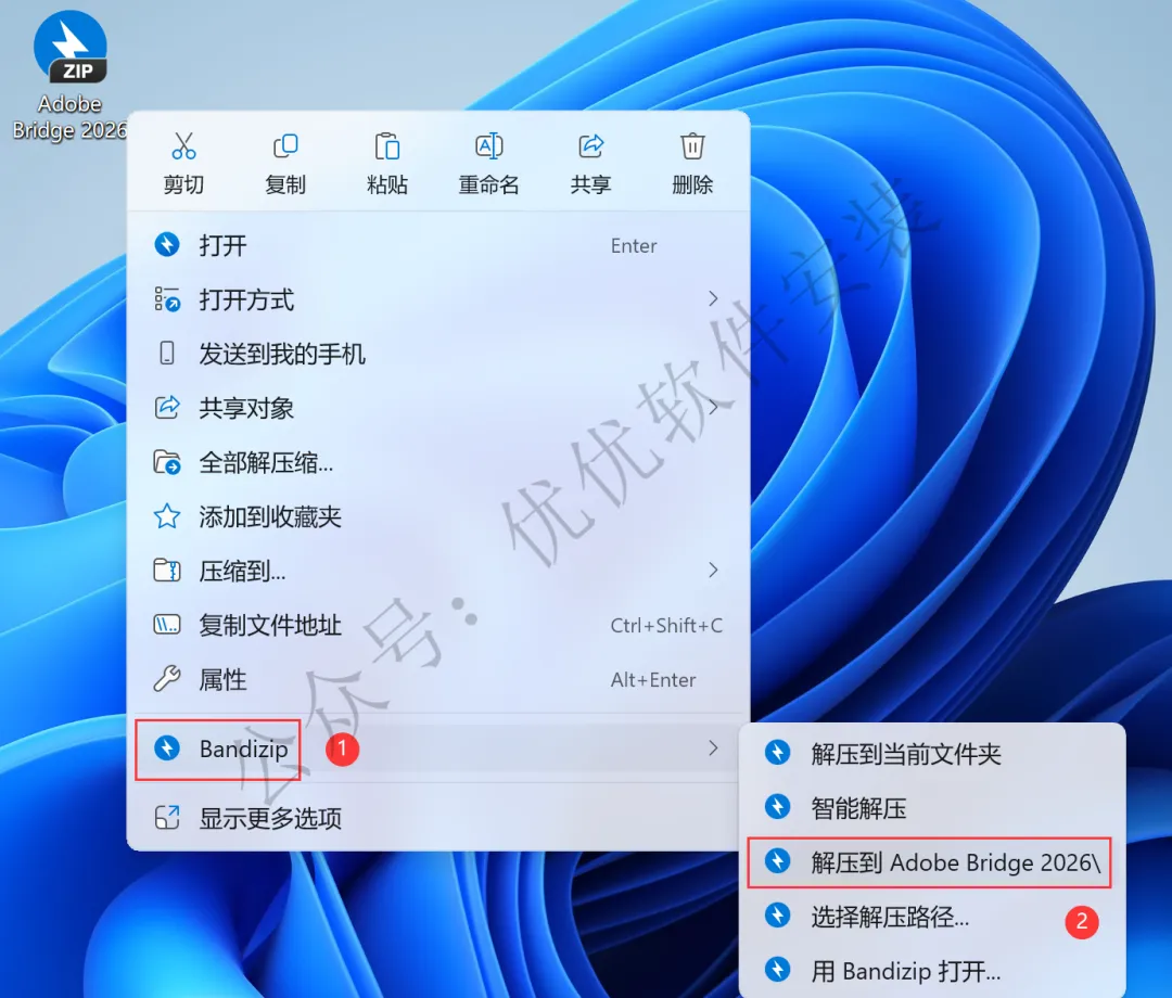 1、下载Adobe Bridge 2026软件安装包到电脑上,右键选择【解压到Adobe Bridge 2026\】
