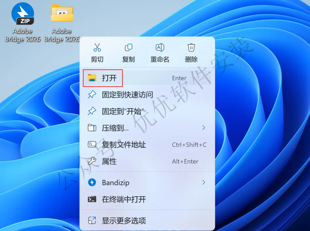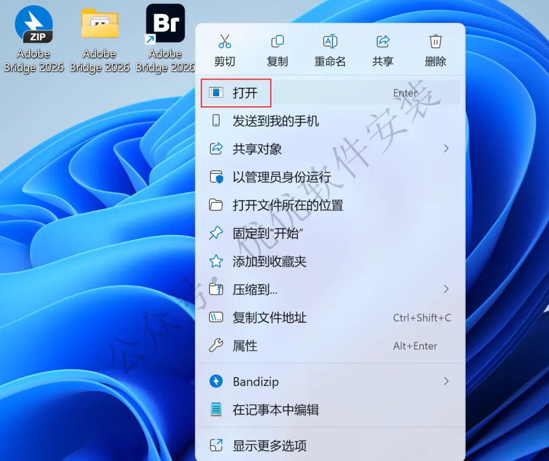 8、右键桌面上的【Adobe Bridge 2026软件图标】,点击【打开】