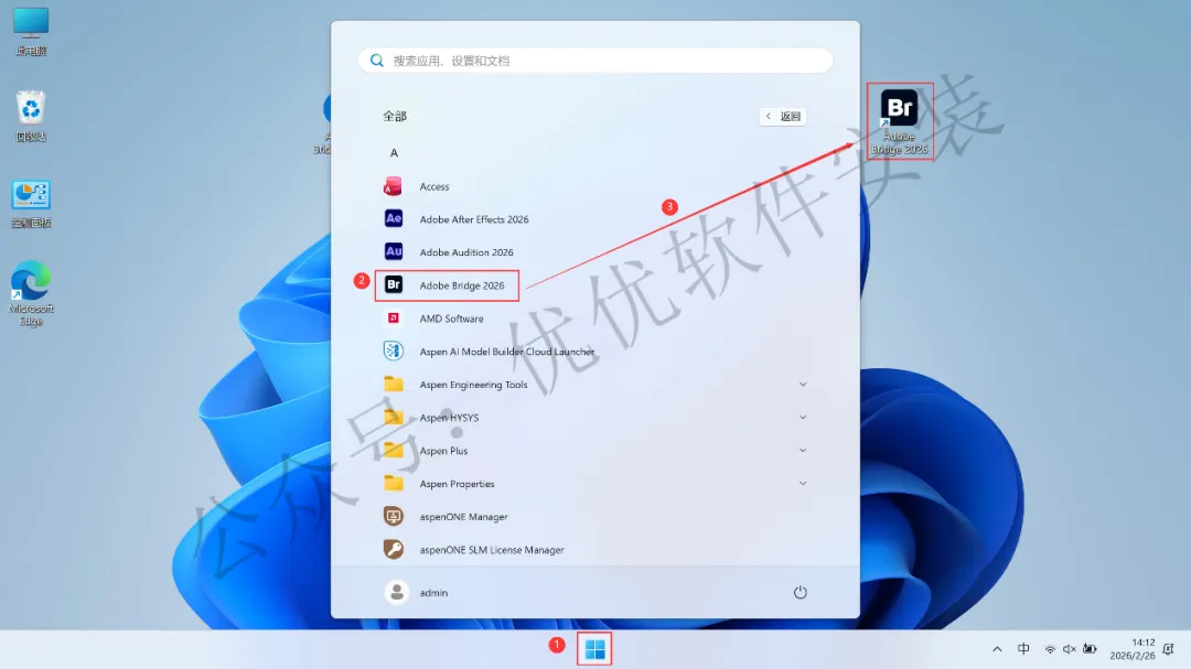 7、回到桌面,回到桌面,点击任务栏的【开始菜单】,在【所有应用】中找到【Adobe Bridge 2026软件图标】,将软件图标拖到桌面上,完成软件桌面快捷方式的创建