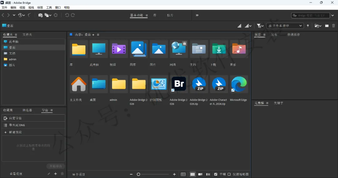 Adobe Bridge 2026是摄影人重要的后期软件之一,常常配合Adobe Photoshop使用,大大提高后期效率。Adobe Bridge是Adobe开发的一个组织工具程序。这是一款数字资产管理软件,从Bridge中可以查看、搜索、排序、管理和处理图像文件,还可以创建新文件夹、对文件进行重命名、移动和删除操作、编辑元数据、旋转图像以及运行批处理命令,以及查看有关从数码相机导入的文件和数据的信息等等。