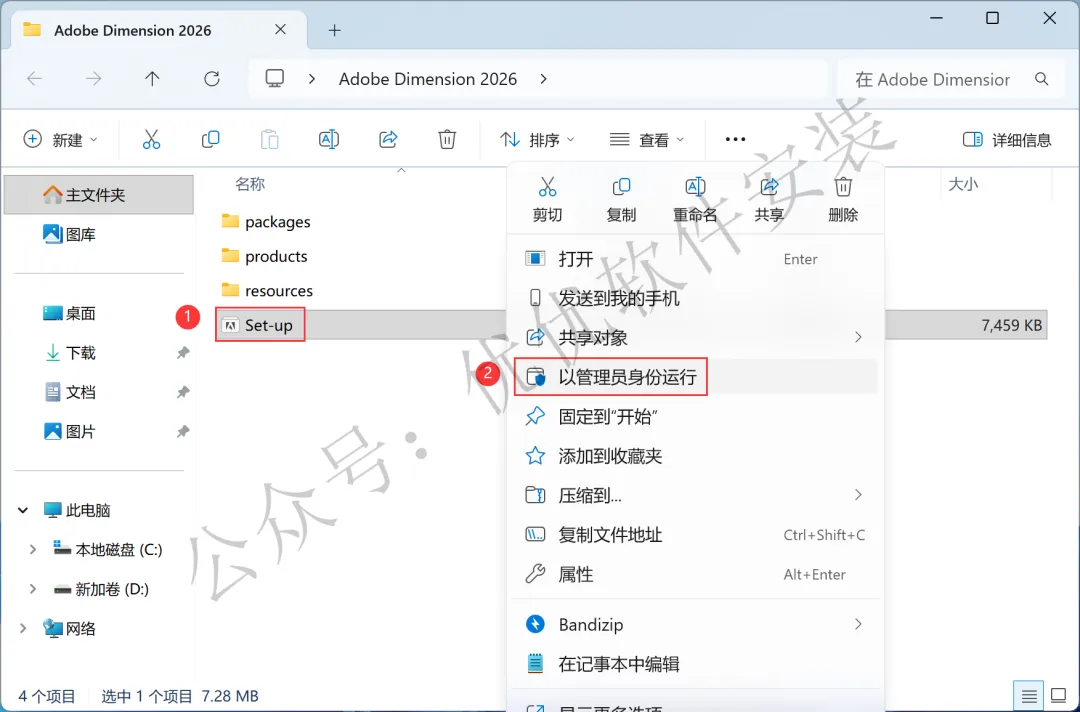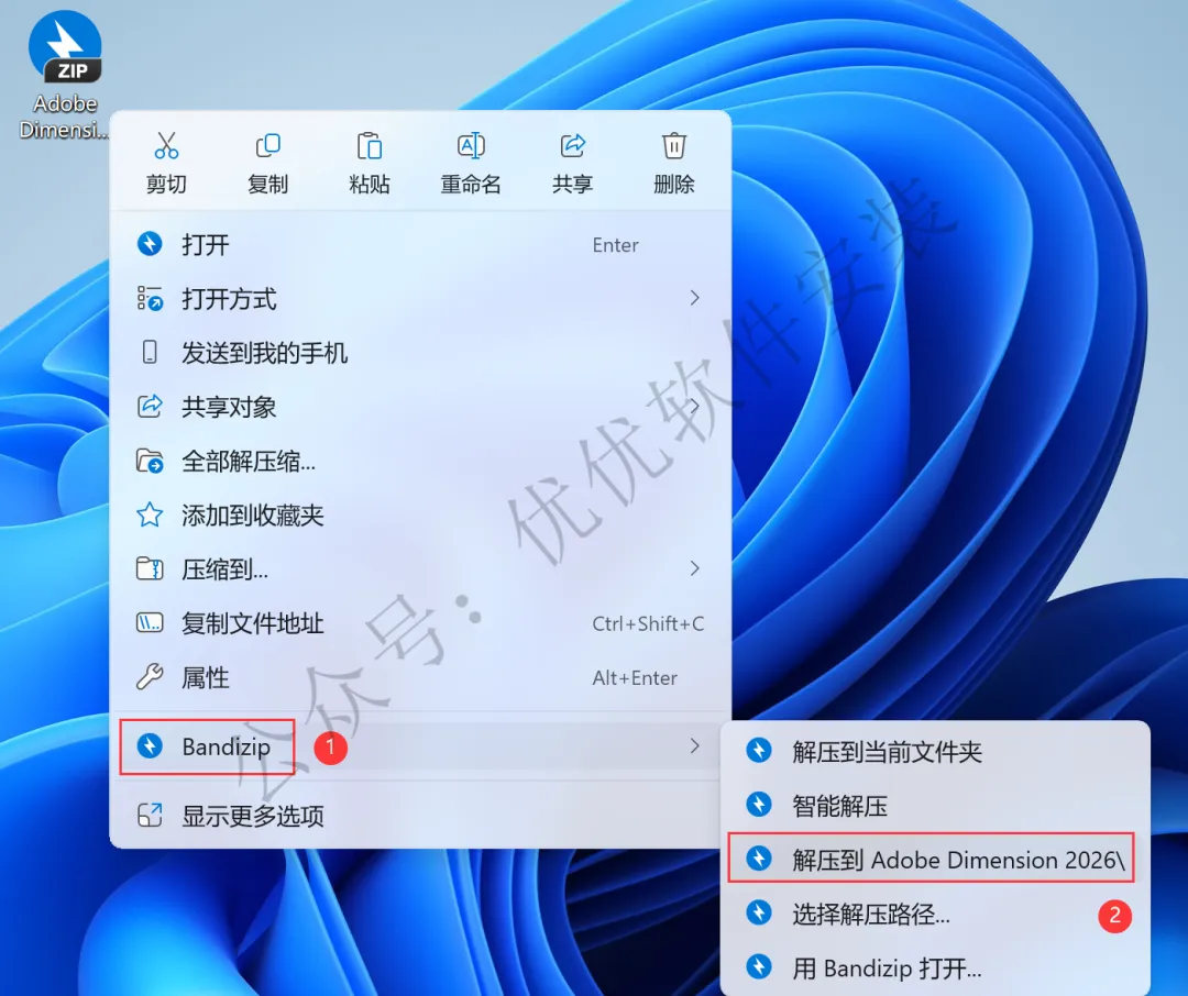 1、下载Adobe Dimension 2026软件安装包到电脑上,右键选择【解压到Adobe Dimension 2026\】