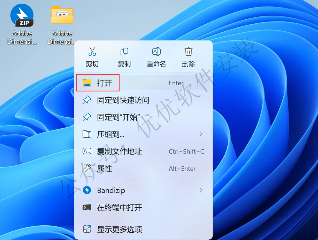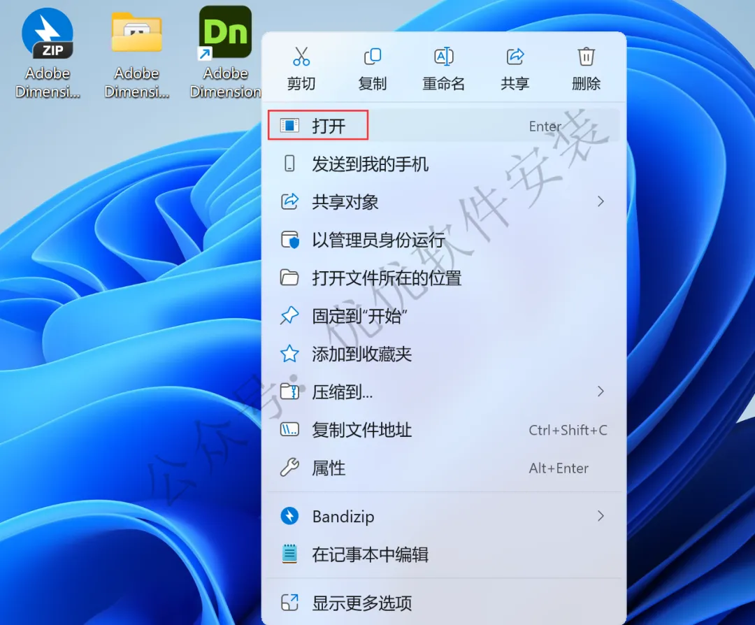 8、回到桌面,右键桌面上的【Adobe Dimension 2026软件图标】,点击【打开】