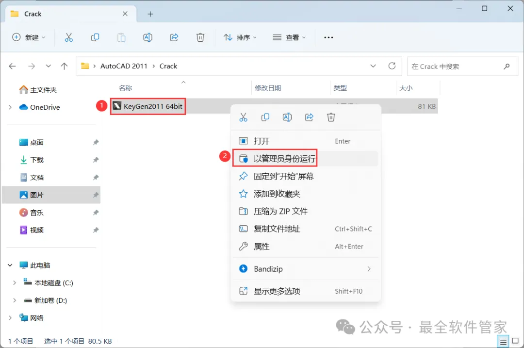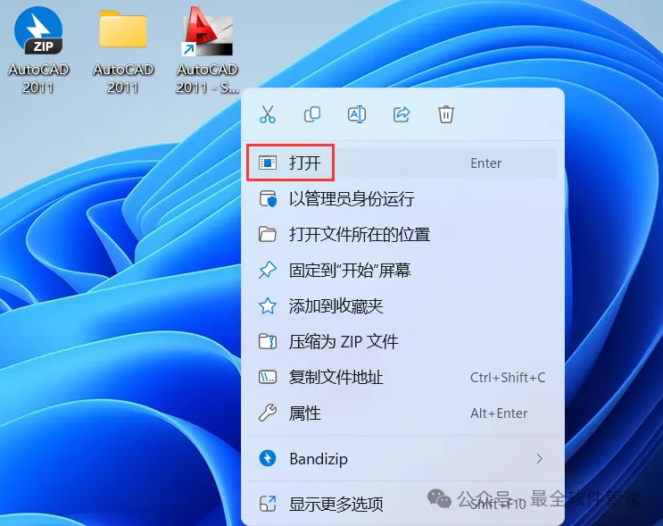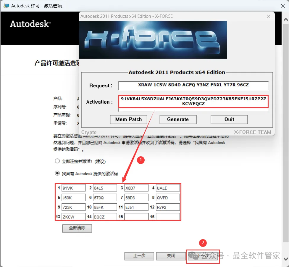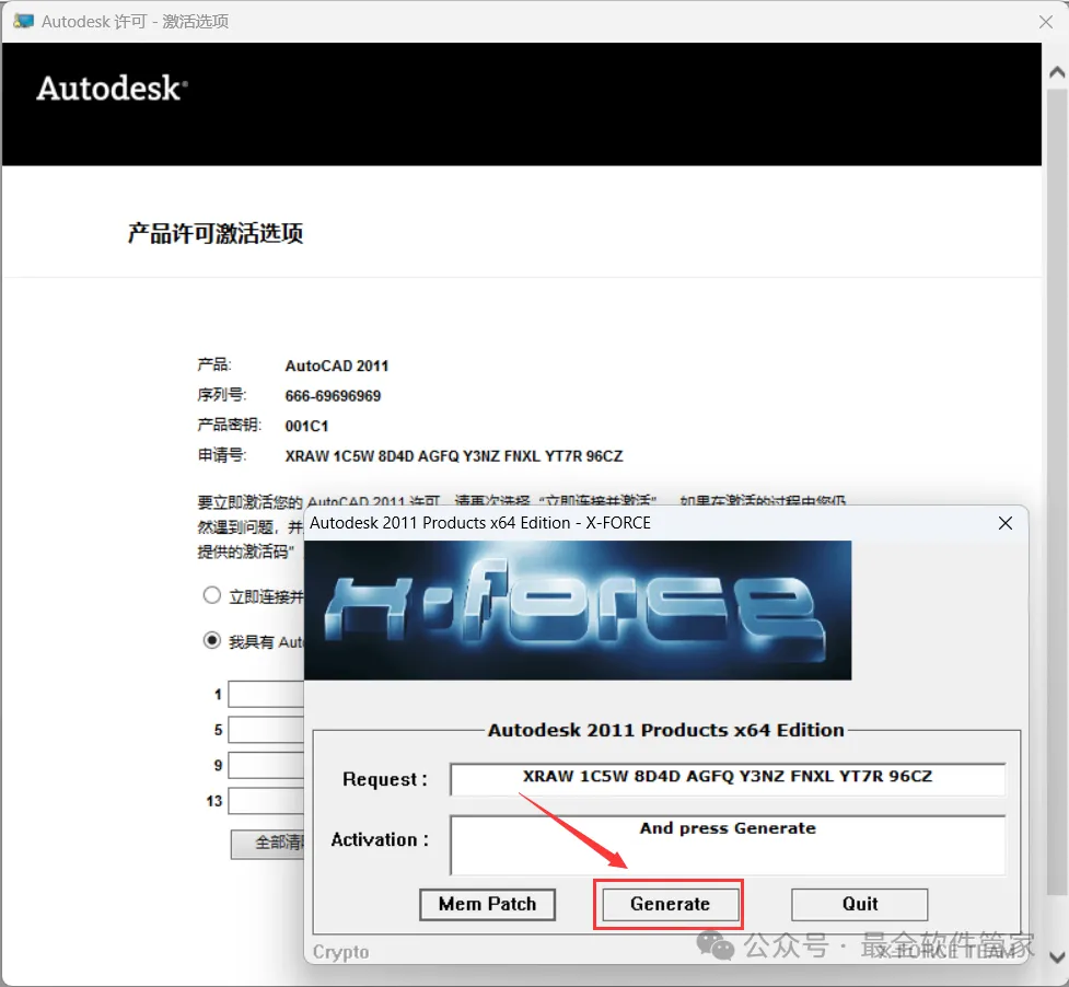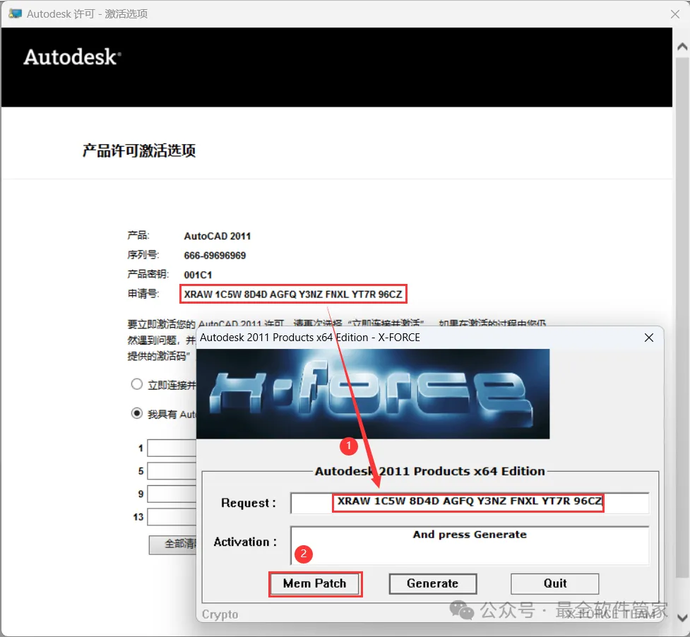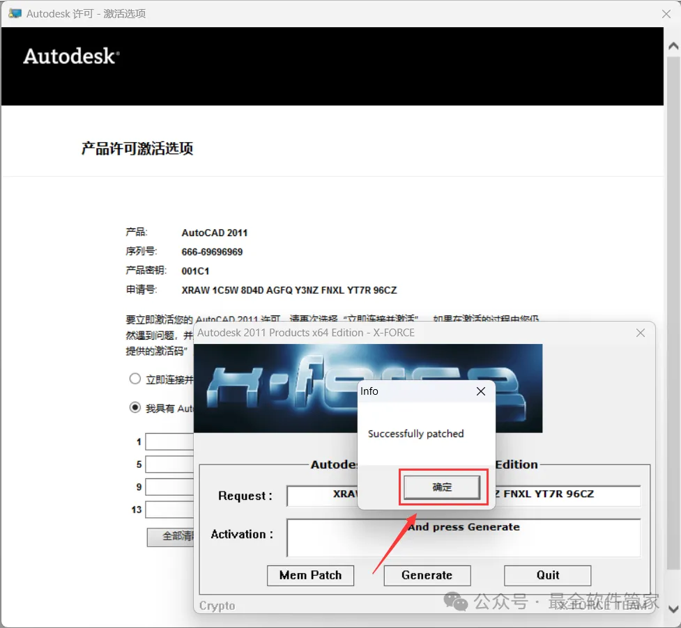 [不限速下载]:免费获取百度网盘不限速下载工具。公众号内回复:不限速[注意事项]:安装前请关闭网络、杀毒软件和防火墙,否则易安装失败。公众号内回复:1[解压软件]:小编用的解压软件是Bandizip,获取Bandizip软件安装包。公众号内回复:21、下载AutoCAD 2011软件安装包到电脑上,右键选择【解压到AutoCAD 2011\】4、找到【Setup】应用程序,右键选择【以管理员身份运行】它 8、随意填写英文,序列号输入:666-69696969,产品密钥输入:001C1,再点击【下一步】 11、勾选【Express Tool】,软件默认安装在C盘,可自定义更改软件安装位置,这里小编选择安装在D盘;再点击【下一步】 16、软件安装成功,不勾选【查看…】,再点击【完成】17、回到桌面,右键桌面上的【AutoCAD 2011软件图标】,点击【打开】 22、回到桌面,右键桌面上的【AutoCAD 2011软件图标】,点击【打开】25、回到AutoCAD 2011文件夹,找到【Crack】文件夹,右键【打开】它 26、找到【KeyGen2011】程序,右键选择【以管理员身份运行】它27、打开软件界面,将软件的【申请号】填入到程序的【Requset】内,再点击【Mem Patch】 30、将程序的【Activation】填入到软件的【激活码】内,再点击【下一步】 33、以上就是AutoCAD 2011软件安装的全过程,要是对你有帮助的话,请为小编点个赞! 免责声明:软件资源均来源于网络,仅供用户交流学习与研究使用,版权归属原版权方所有,版权争议与本公众号无关,用户本人下载后不能用作商业或非法用途,否则后果均由用户承担责任;如果您访问和下载此文件,表示您同意只将此软件用于参考、学习而非其他用途,否则一切后果请您自行承担,请于下载后24小时内删除,不允许用于商业用途,否则法律问题自行承担。如果您喜欢该软件,请支持正版软件,购买注册,得到更好的正版服务。