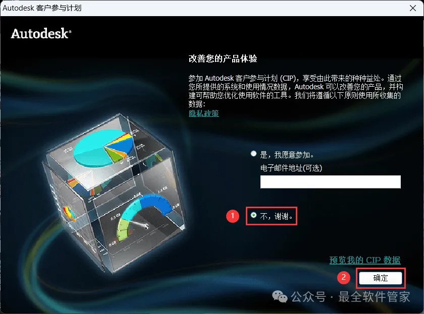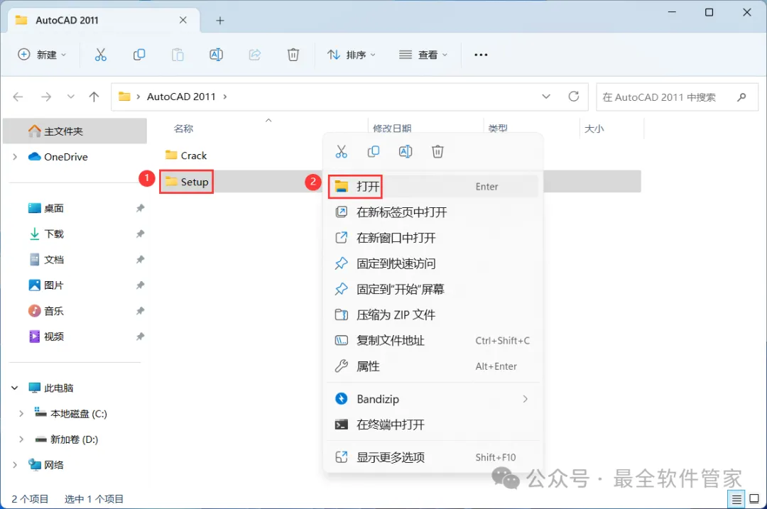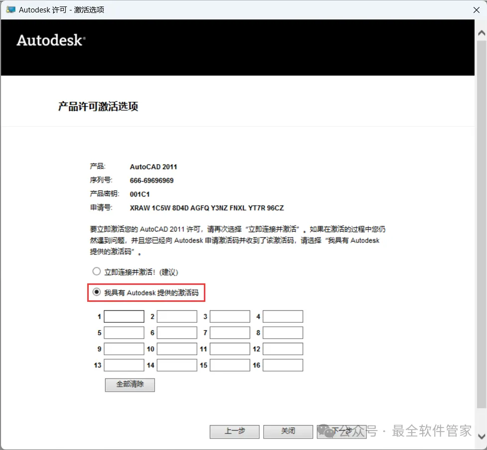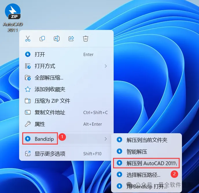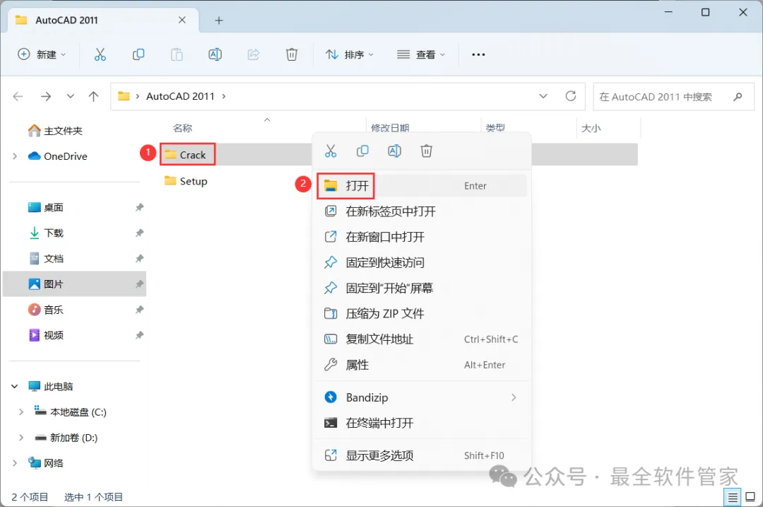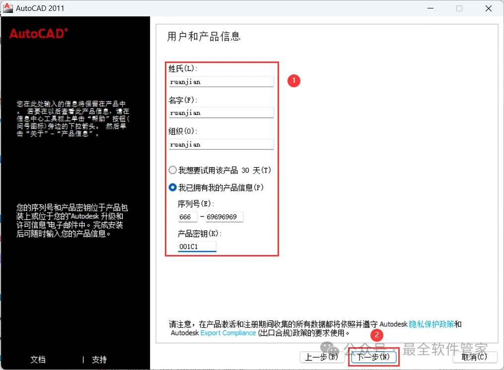 [不限速下载]:免费获取百度网盘不限速下载工具。公众号内回复:不限速[注意事项]:安装前请关闭网络、杀毒软件和防火墙,否则易安装失败。公众号内回复:1[解压软件]:小编用的解压软件是Bandizip,获取Bandizip软件安装包。公众号内回复:21、下载AutoCAD 2011软件安装包到电脑上,右键选择【解压到AutoCAD 2011\】4、找到【Setup】应用程序,右键选择【以管理员身份运行】它 8、随意填写英文,序列号输入:666-69696969,产品密钥输入:001C1,再点击【下一步】 11、勾选【Express Tool】,软件默认安装在C盘,可自定义更改软件安装位置,这里小编选择安装在D盘;再点击【下一步】 16、软件安装成功,不勾选【查看…】,再点击【完成】17、回到桌面,右键桌面上的【AutoCAD 2011软件图标】,点击【打开】 22、回到桌面,右键桌面上的【AutoCAD 2011软件图标】,点击【打开】25、回到AutoCAD 2011文件夹,找到【Crack】文件夹,右键【打开】它 26、找到【KeyGen2011】程序,右键选择【以管理员身份运行】它27、打开软件界面,将软件的【申请号】填入到程序的【Requset】内,再点击【Mem Patch】 30、将程序的【Activation】填入到软件的【激活码】内,再点击【下一步】 33、以上就是AutoCAD 2011软件安装的全过程,要是对你有帮助的话,请为小编点个赞! 免责声明:软件资源均来源于网络,仅供用户交流学习与研究使用,版权归属原版权方所有,版权争议与本公众号无关,用户本人下载后不能用作商业或非法用途,否则后果均由用户承担责任;如果您访问和下载此文件,表示您同意只将此软件用于参考、学习而非其他用途,否则一切后果请您自行承担,请于下载后24小时内删除,不允许用于商业用途,否则法律问题自行承担。如果您喜欢该软件,请支持正版软件,购买注册,得到更好的正版服务。