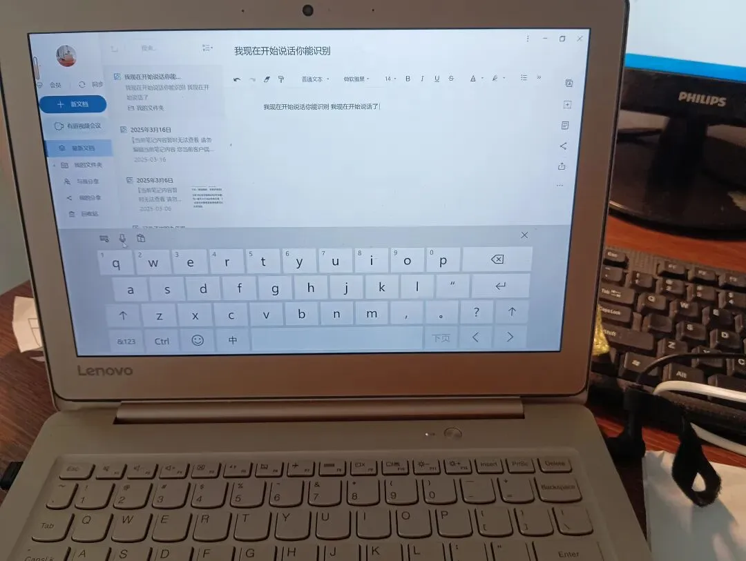 后来连虚拟键盘都翻出来了,点那个键盘图标,再点虚拟键盘上的麦克风,还是不太行,识别慢,还老出错。