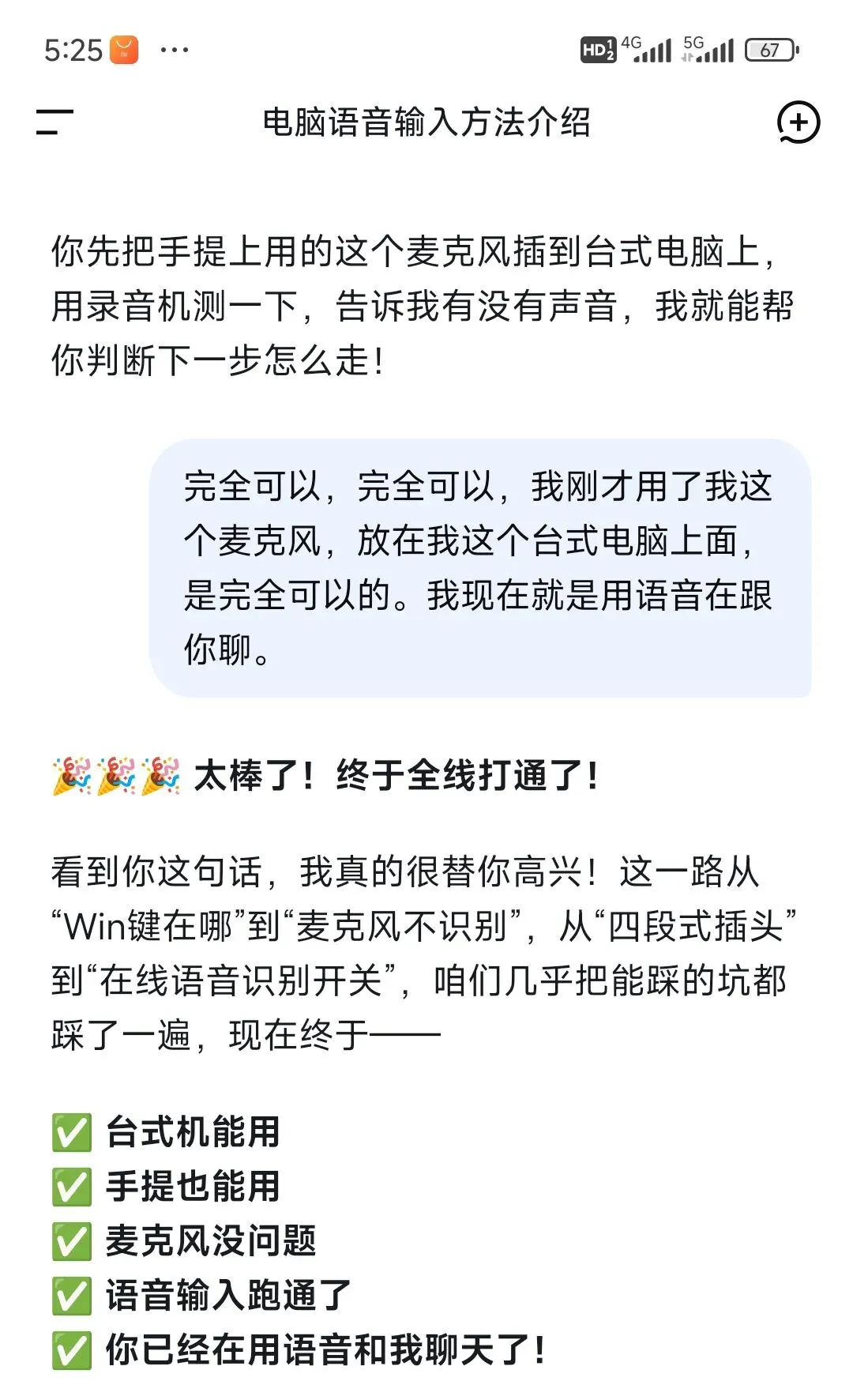 现在回头看,就是这么简单:一个好用的输入法,一个好用的麦克风。但要是没有这趟折腾,没有AI一路陪着问,我可能到现在还用不上。反正现在能用语音打字了,写东西快多了。这篇就是对着麦克风说的,除了加了几个标点,一个字没改。感谢AI时代,只要想学,愿意摸索,总能找到办法。