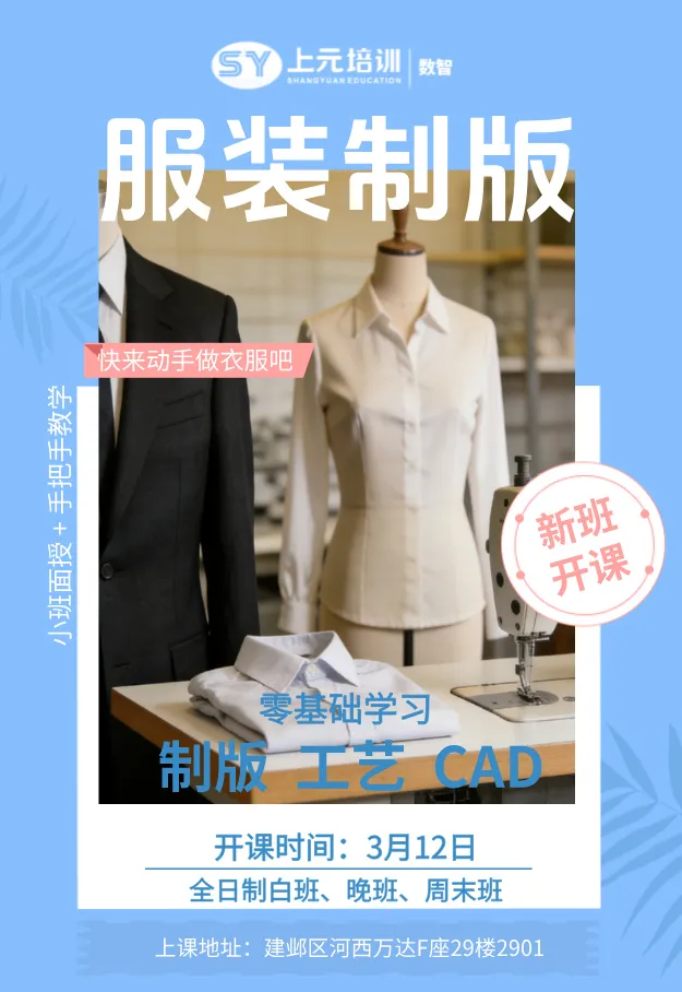 无论你是零基础的服装小白,还是想要突破瓶颈的在职版师,上元教育都能为你提供从手工制版 → 缝纫工艺 → 电脑CAD的一站式学习路径-10。