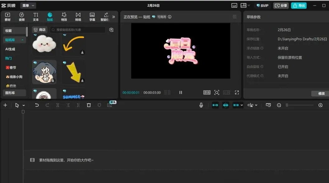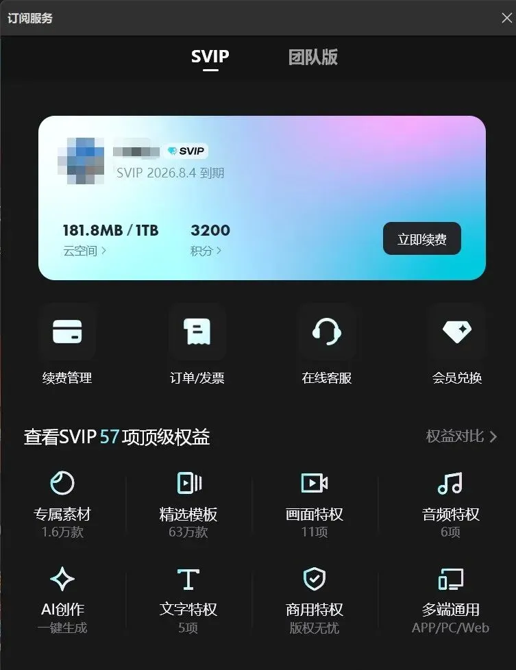 所有模板/滤镜/音乐/贴纸0元任意用;独享AI配音+智能字幕+镜头追踪+人声美化等高级功能;支持4K无损导出,无需会员直接高清导出!