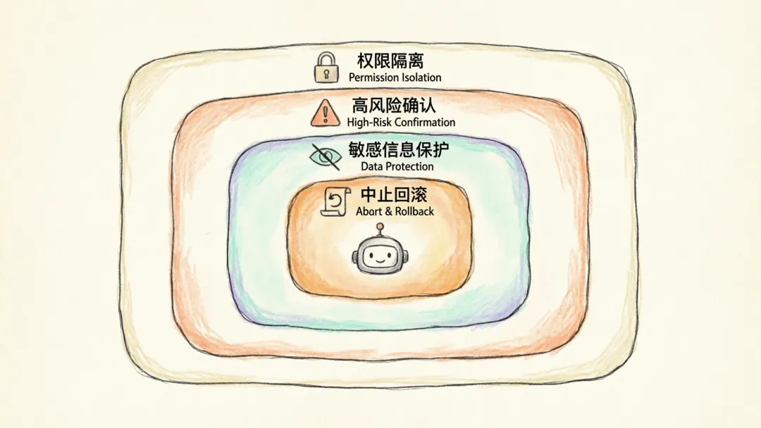 通过权限控制、人工确认和日志审计保证安全性