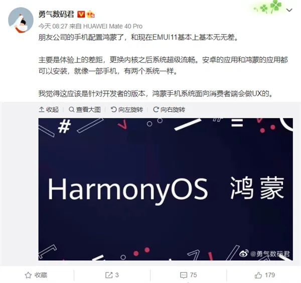 昨日,就有博主爆料称,朋友公司的手机配置鸿蒙了,和现在EMUI 11基本无差。主要是体验上的差距,更换内核之后系统超级流畅。安卓的应用和鸿蒙的应用都可以安装,就像一部手机有两个系统一样。