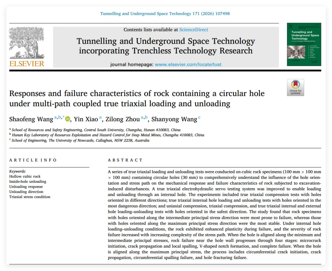Wang S, Xiao Y, Zhou Z, et al. Responses and failure characteristics of rock containing a circular hole under multi-path coupled true triaxial loading and unloading[J]. Tunnelling and Underground Space Technology, 2026, 171: 107498.
