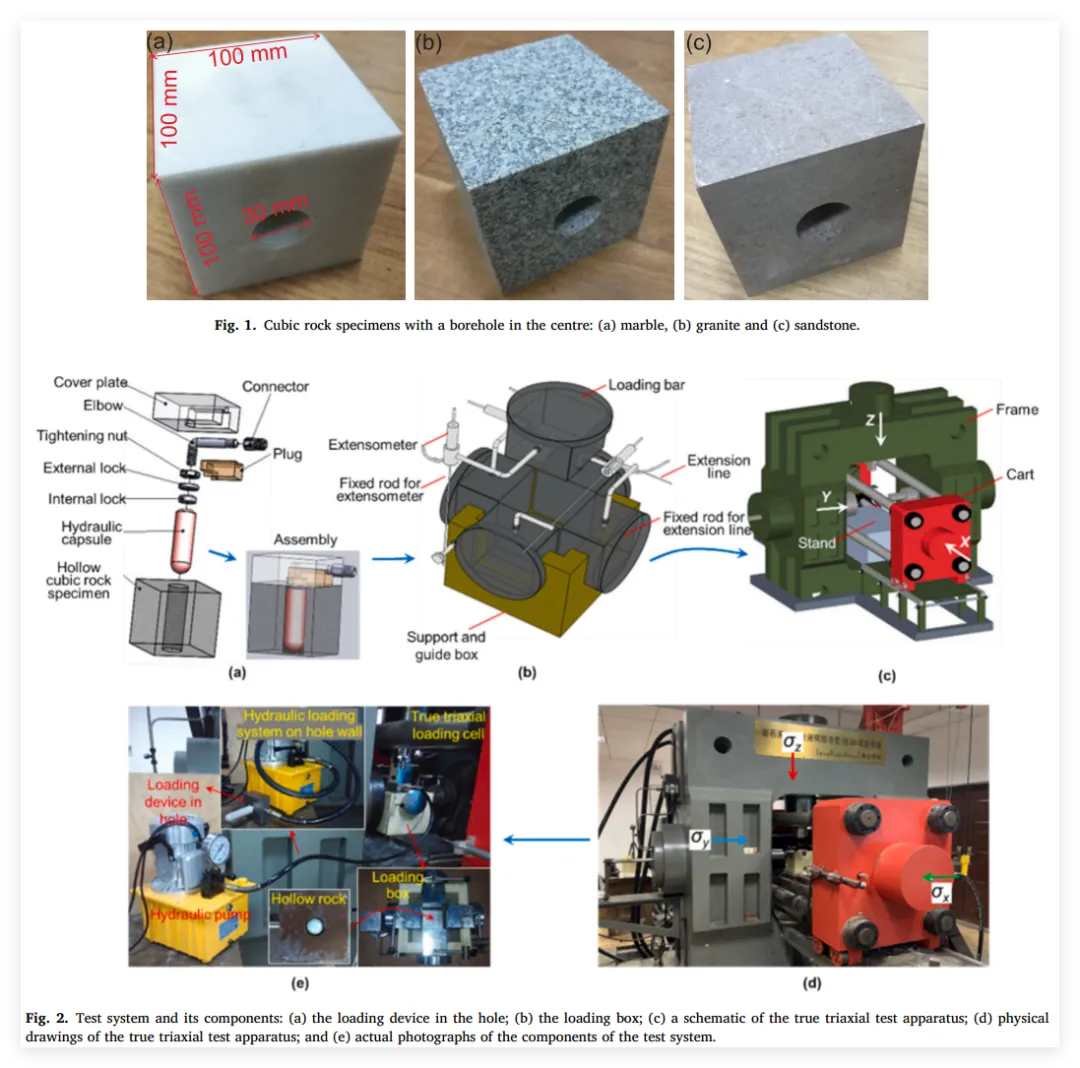 为保证试样的均质性,实验所用的岩石材料全部取自巨大岩块,包括大理岩(变质岩)、花岗岩(岩浆岩)和砂岩(沉积岩) 。首先加工出直径50 mm、长100 mm的标准圆柱体试样以及直径50 mm、厚25 mm的圆盘试样,每种类型准备5个平行试样;通过单轴压缩、三轴压缩和巴西劈裂试验,详细测定了材料的杨氏模量、泊松比、抗拉强度、内聚力、内摩擦角以及不同围压(30 MPa和60 MPa)下的抗压强度等基础物理力学参数(例如,大理岩、花岗岩和砂岩的单轴抗压强度分别为129.22 MPa、126.24 MPa和97.79 MPa) 。为了模拟深部硬岩真实的三维应力状态,制备了尺寸为 $100 mm \times 100 mm \times 100 mm$、中心带有直径30 mm圆孔的空心立方体试样,且试样的六个面均经过严格抛光,以最大程度地减小加载过程中的端面摩擦约束和边界效应 。选用30 mm孔径的原因在于:地下工程中开挖扰动的影响区通常为开挖半径的3至5倍;本实验中试样宽度与孔径之比为3.33,刚好满足此影响区下限标准 。受限于真三轴实验在室内环境对设备超高加载能力及大尺度样品取样控制的挑战,采用边长100 mm且孔径介于25至50 mm的立方体岩样是目前被广泛认可和应用的尺度 。