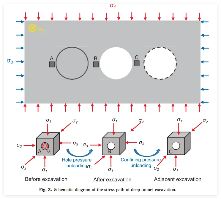 众所周知,深部开挖卸载通常包含两个典型阶段:隧道开挖面边界约束释放引起的瞬时卸载阶段,以及开挖完成后由相邻隧道继续开挖或区域应力重分布引起的后续应力调整卸载阶段 。为了在力学上真实再现深部巷道围岩的应力演化,本研究设计了三种核心加卸载路径 :