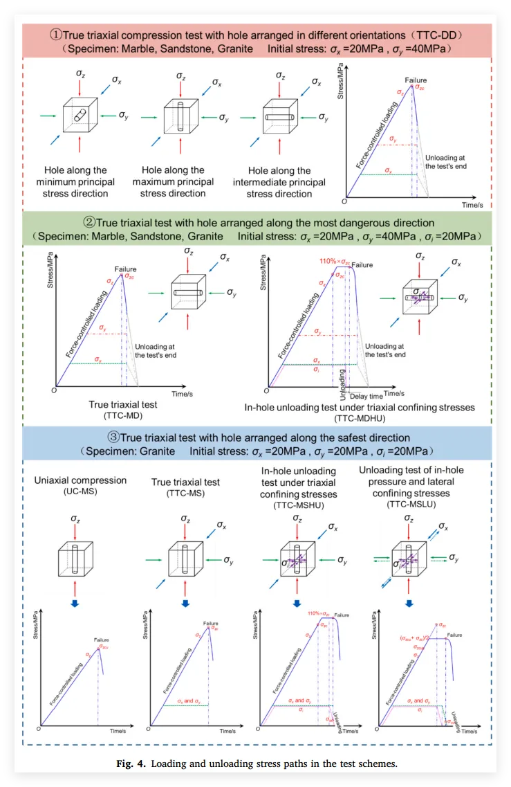 (3) 最安全布置方向下的综合卸载测试(UC-MS, TTC-MS, TTC-MSHU, TTC-MSLU): 针对花岗岩试样,在孔洞沿最大主应力(最安全)方向布置、且初始应力场设定为均匀状态(σx=σy=20 MPa)的条件下,分别开展单轴压缩、真三轴压缩、真三轴孔内加卸载,以及孔内压力与侧向围压综合卸载试验 。此处的侧向围压卸载专门用于模拟巷道达到暂时稳定后,因相邻巷道施工或区域应力调整而产生的后续应力卸载阶段 。
