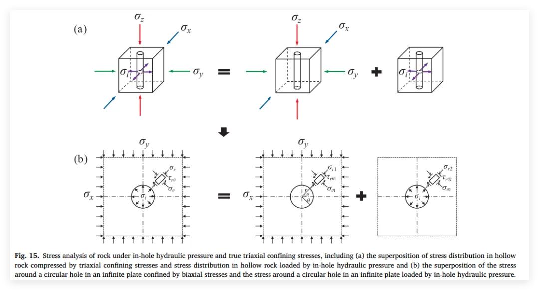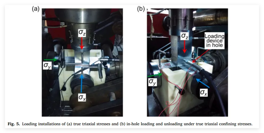 为全面认识孔洞方向与应力路径对受开挖扰动岩石力学响应及破坏特征的影响,对含圆孔(30 mm)的立方体岩石试样(100 mm × 100 mm × 100 mm)进行了一系列真三轴加卸载试验 。改进了真三轴电液伺服测试系统,以实现通过内部孔洞进行加卸载 。实验方案包括:孔洞朝向不同方向的真三轴压缩试验;孔洞朝向最危险方向的真三轴内孔加卸载试验;以及孔洞朝向最安全方向的单轴压缩、三轴压缩及真三轴内外孔加卸载综合试验 。研究发现,孔洞沿中间主应力方向布置的岩石试样最容易发生破坏,而孔洞沿最大主应力方向布置的试样最稳定 。在内孔加卸载条件下,岩石在破坏过程中表现出增强的塑性,且岩石破坏的严重程度随应力路径复杂性的增加而增加 。当孔洞沿最小和中间主应力方向布置时,孔壁附近的岩石破坏经历微裂纹萌生、裂纹扩展与局部剥落、V型槽形成及完全破坏四个阶段 。当孔洞沿最大主应力方向布置时,破坏过程则包括周向裂纹萌生、裂纹扩展、周向剥落破坏及孔洞压裂破坏四个阶段。
