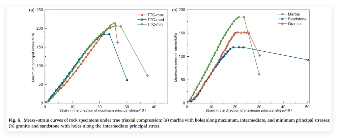 2、亮点二:揭示最优与最劣开挖朝向: 系统量化并对比了不同三维主应力方向与孔洞轴向的组合对面岩力学响应的影响,明确界定孔洞沿中间主应力方向布置时最易失稳(最危险布置),而沿最大主应力方向布置时抗压稳定性最佳(最安全布置)。