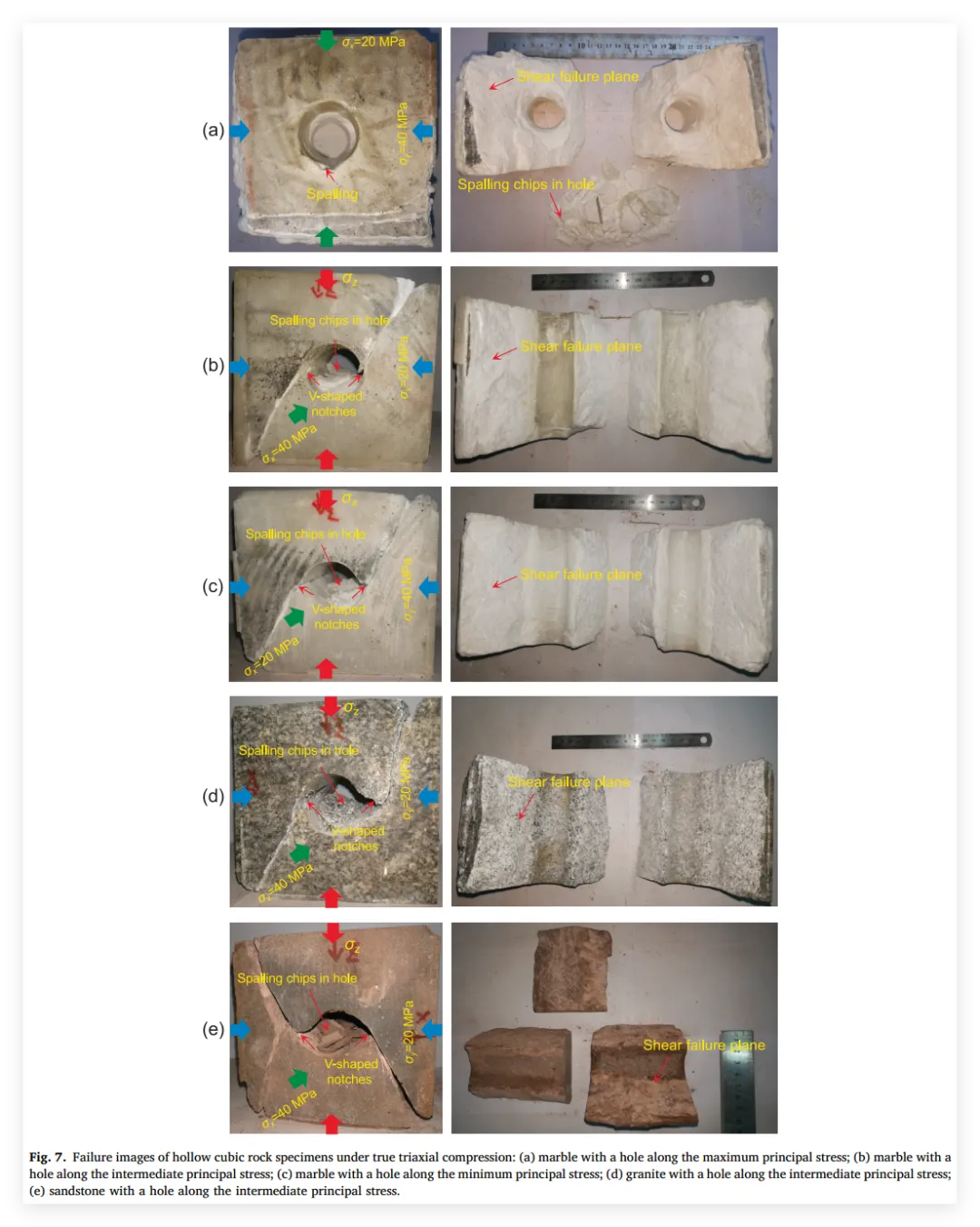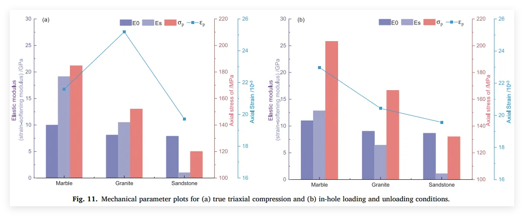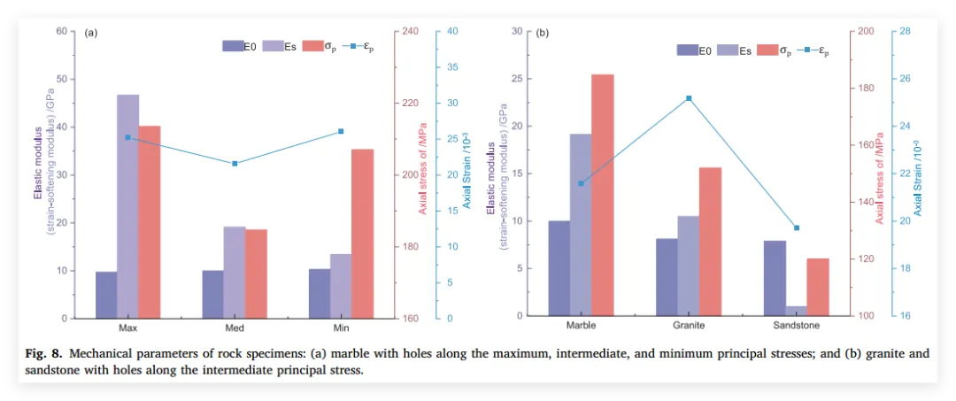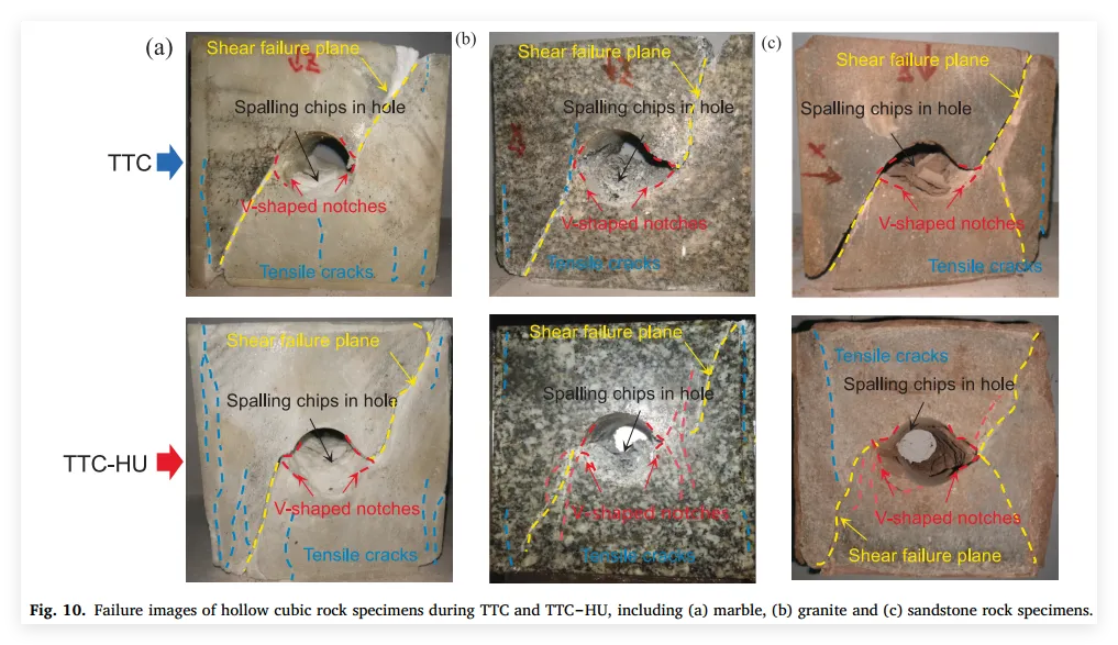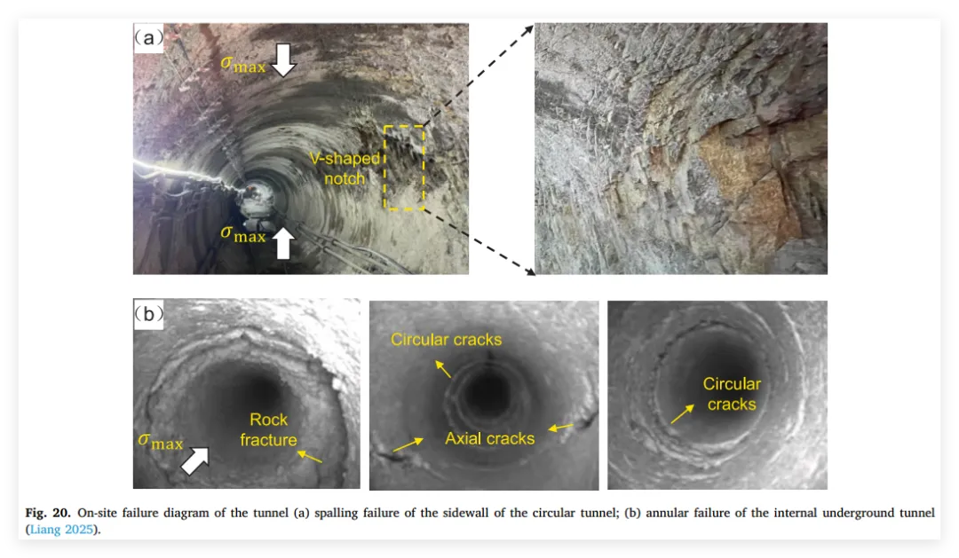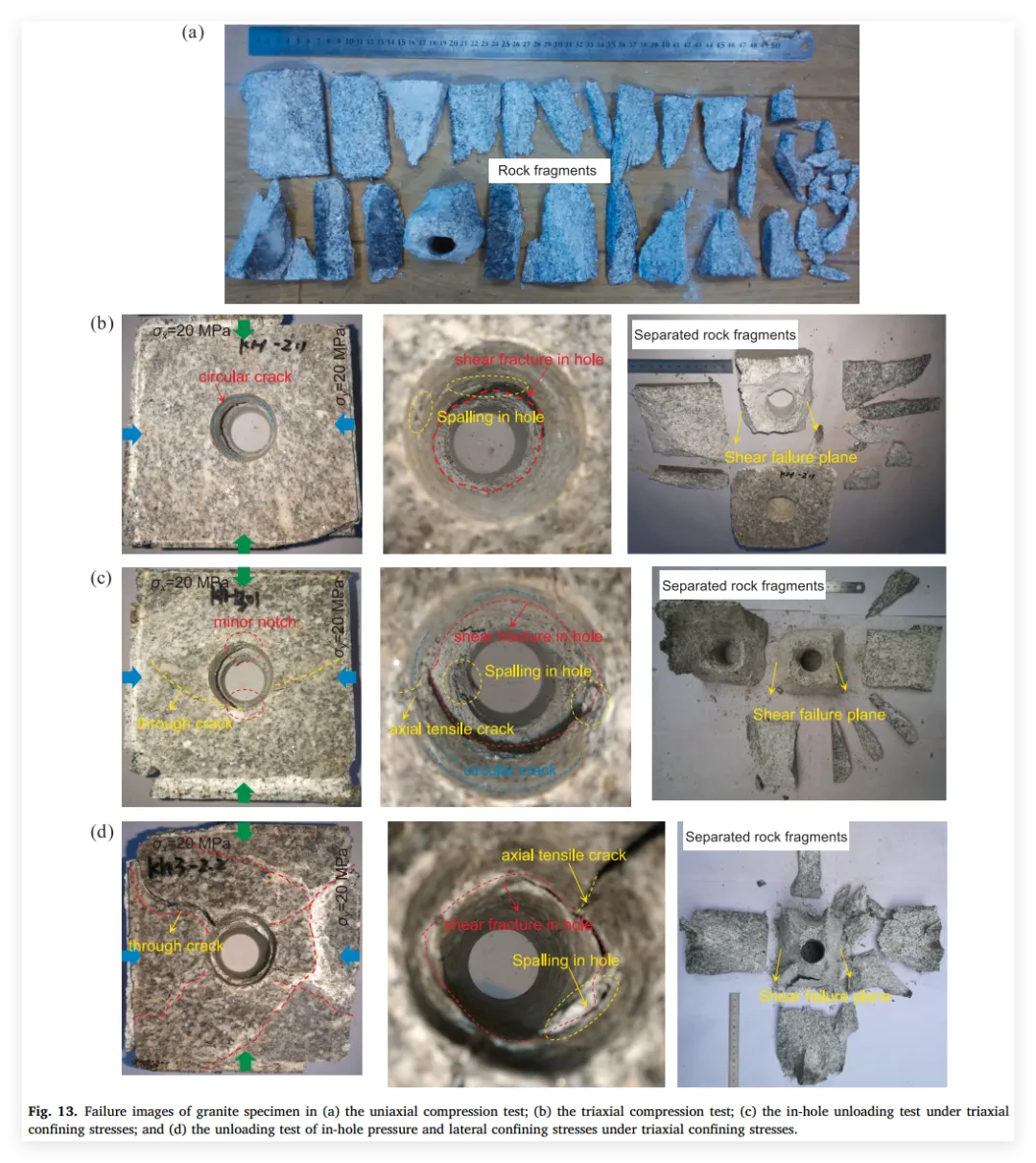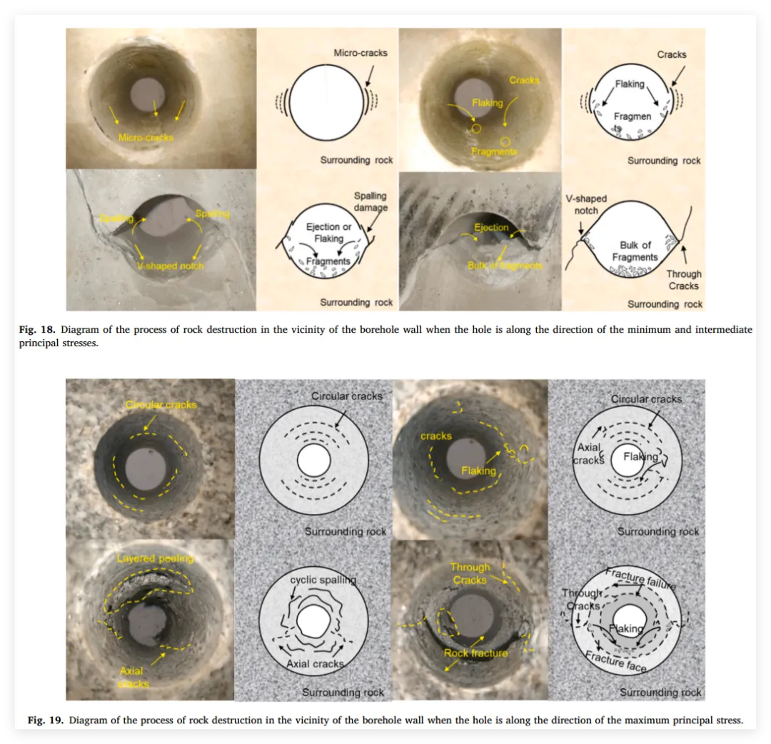 3、亮点三:阐明渐进破坏与多阶段演化机制: 深入揭示了孔洞周围岩体在不同主应力朝向下的破坏机制差异。指出孔洞垂直于最大主应力布置时表现出显著的V型槽剥落(剪切破坏为主),而平行于最大主应力时则产生周向剥裂和轴向张拉开裂(拉-剪复合破坏),并精细划分了各自演化的四个典型阶段。