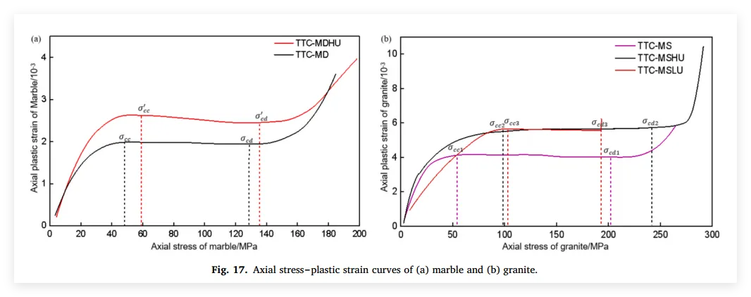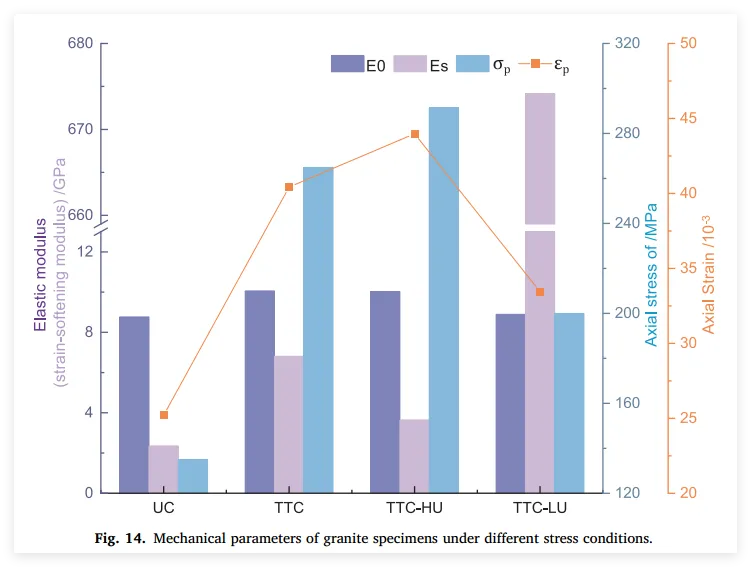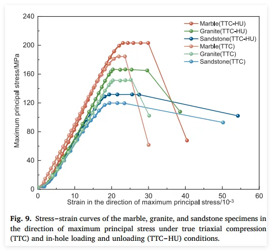 单轴与常规三轴压缩试验均采用力控加载,加载速率恒定为 2 kN/s ;孔内应力通过应力控制方式施加至孔壁,速率为 0.2 MPa/s,且与外部三轴应力同步加载,以真实模拟开挖前的应力状态 。对于卸载过程,采用“极速卸载”模式:孔内液压以 200 MPa/s 的极高率卸载,外部围压以 100 kN/s 的速率卸载,精准再现了瞬态开挖引起的应力调整与卸载扰动 。为确保试样在预定的卸载阶段发生破坏,特定的轴向加载(Z向)被精心设计:在真三轴孔内单卸载测试(TTC-HU)中,卸载前需将Z向应力继续提升至1.1倍的真三轴峰值强度(1.1 σzc),使岩石处于临界高应力状态,既防止了轴向加载阶段的提前破坏,又显著增强了试样对内孔卸载引起应力重分布的敏感性 ;而在真三轴内外孔综合卸载测试(TTC-LU)中,卸载前则将Z向应力提升至单轴与真三轴抗压极限的平均值,这一中间态应力水平确保了试样能在孔内卸载第一阶段后依然保持稳定,而在随后的外部侧向围压卸载阶段才被诱发破坏,从而实现了两阶段卸载诱发破坏过程的有效分离与观察 。