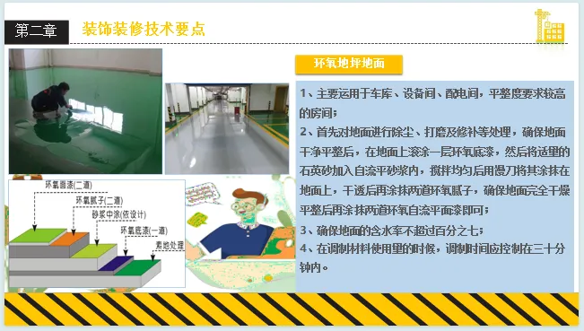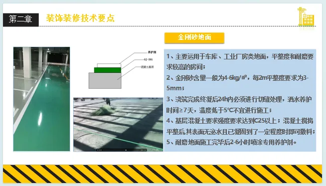 ✅地面工程:墙地砖坚持墙砖压地砖,砖缝宽度控制在 1-2mm,对缝错缝横平竖直;地漏 300mm 内做 3% 找坡,下水管必做存水弯或加装防臭漏芯;金刚砂地面终凝 24h 内切缝,养护≥7 天,环氧地坪含水率不超 7%,材料调制 30 分钟内用完。