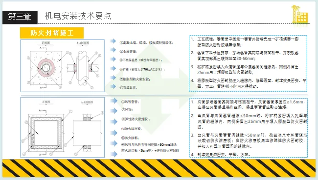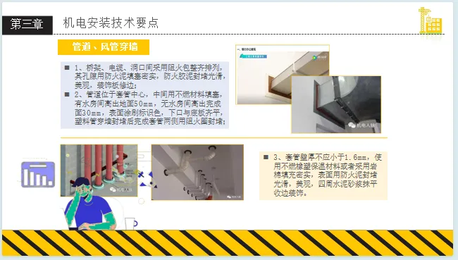 ✅管道与风管:穿墙套管壁厚≥1.6mm,有水房间高出地面 50mm、无水房间 30mm,管道居中,缝隙用不燃材料填塞;防火封堵按流程施工,矿棉填塞 + 膨胀防火密封胶修整,密实平整,管道 48 小时内不扰动。