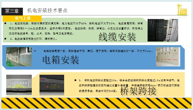✅电气工程:电缆桥架电力电缆填充率≤40%、控制电缆≤50%,钢制桥架超 30m 设伸缩节,跨接用 4mm² 铜芯软线打 6-8 圈;电箱安装高度一致,箱柜间接缝≤2mm;开关插座按规范高度排布,成排安装横平竖直,标识清晰。