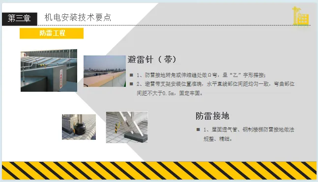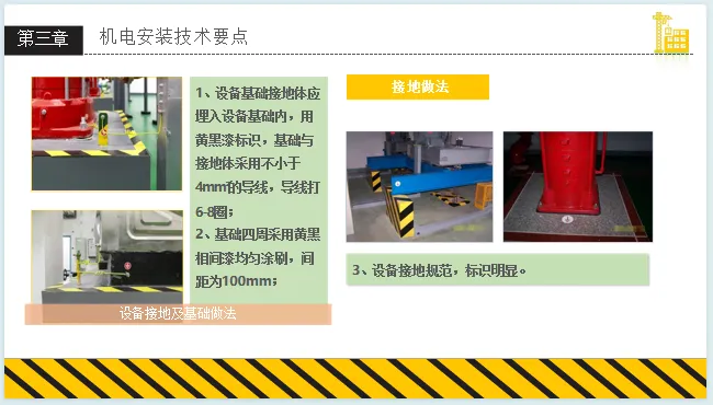 ✅防雷与接地:避雷带转角做 Ω 弯,支架间距均匀,弯曲部位≤0.5m;设备基础接地体埋入基础,黄黑漆标识,基础四周黄黑漆间距 100mm 涂刷;屋面透气管、钢制楼梯防雷接地规整精细。