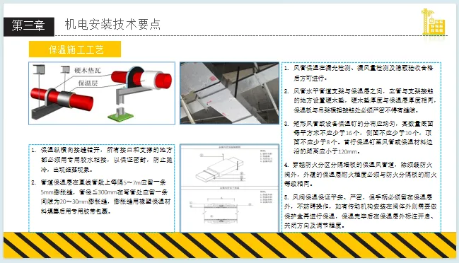 ✅保温施工:管道保温纵横向接缝错开,直线管段 5-7m 留 5mm 膨胀缝;风管保温钉分布均匀,底面≥16 个 /㎡、侧面≥10 个 /㎡、顶面≥8 个 /㎡;穿越防火分区的风管保温层,耐火等级与分隔板一致。