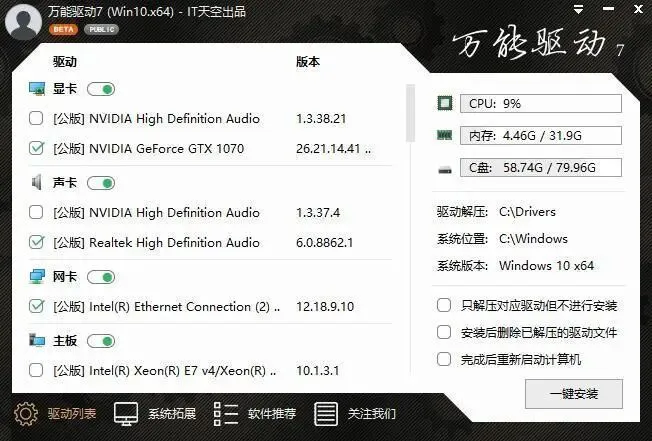 1、采用 IT 天空软件通用的第 4 代构架2、重塑 UI,使操作更加直观,专注于驱动安装3、功能采用模块化设计4、与万能驱动 8 属于不同分支,故功能逻辑不完全一致5、优化驱动数据存储方式6、简化代码构型,优化运行效率7、其他未列出的细节修正