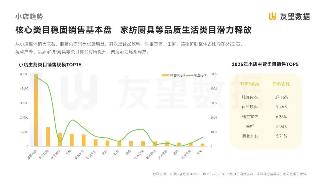 从小店整体销售来看,服饰内衣销售优势明显,其次是食品饮料,珠宝首饰、生鲜、美妆护肤整体占比均在6%左右。运动户外、品质家纺/厨具等类目排名有所提升,赛道潜力逐渐释放。