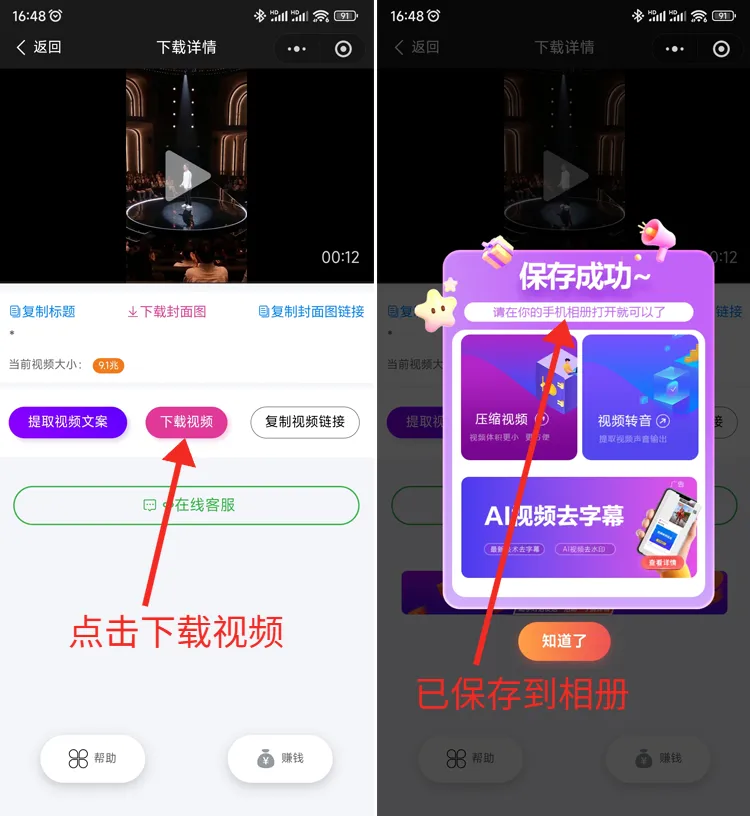 第三步:在下载页面这里,点击下载视频按钮就可以把视频保存到相册啦;