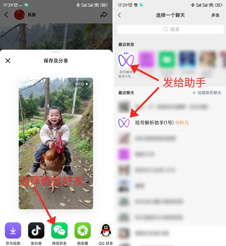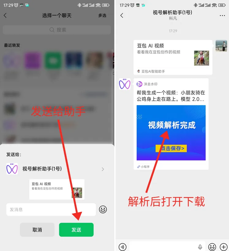 第二步:选择微信好友,然后发给助手(最近没有找到可以搜索一下名称或者在最近聊天那里找一下),等待几秒后,解析完成助手会返回下载卡片,然后打开进去下载;