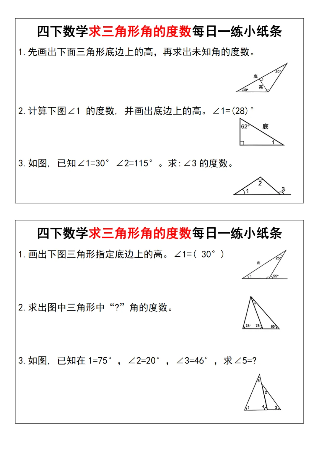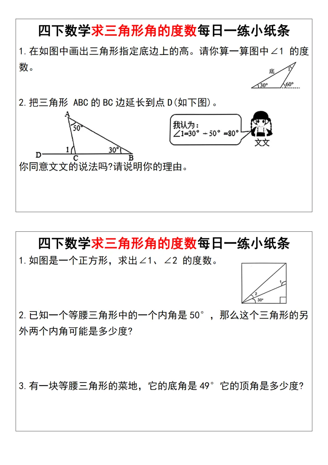 四年级(下)数学 求三角形角的度数每日一练小纸条